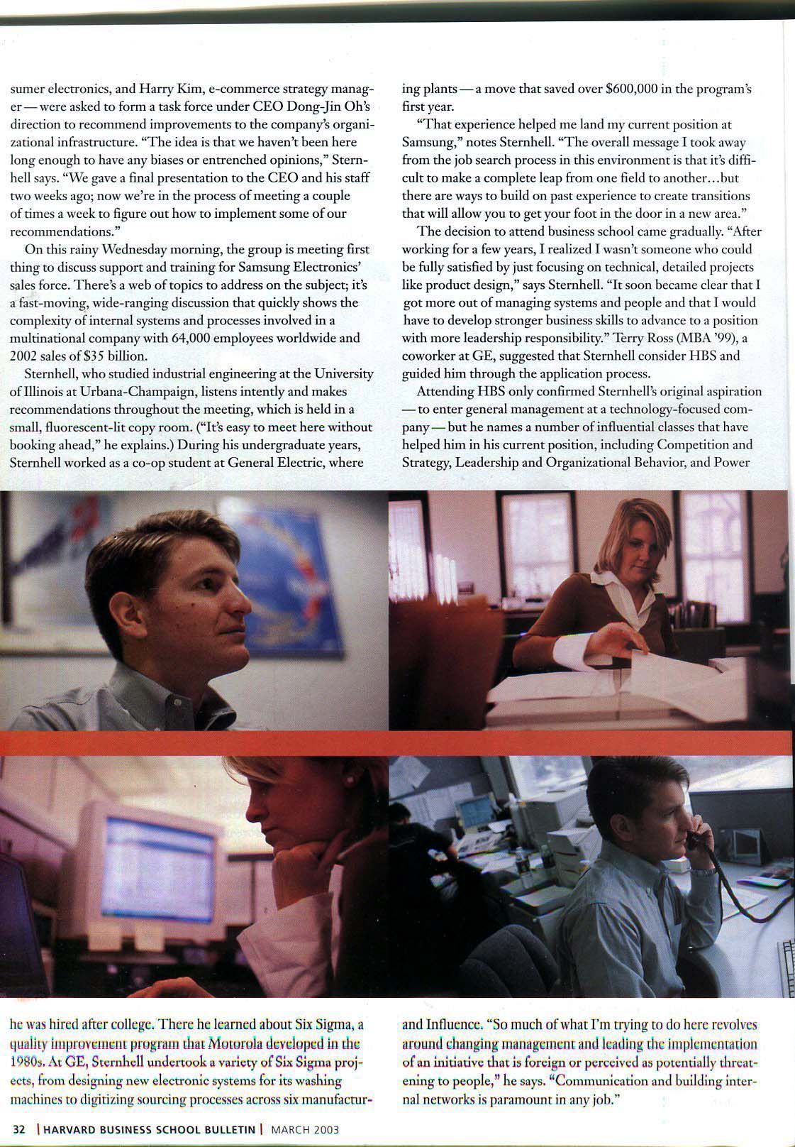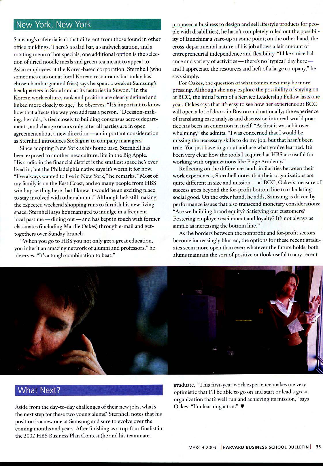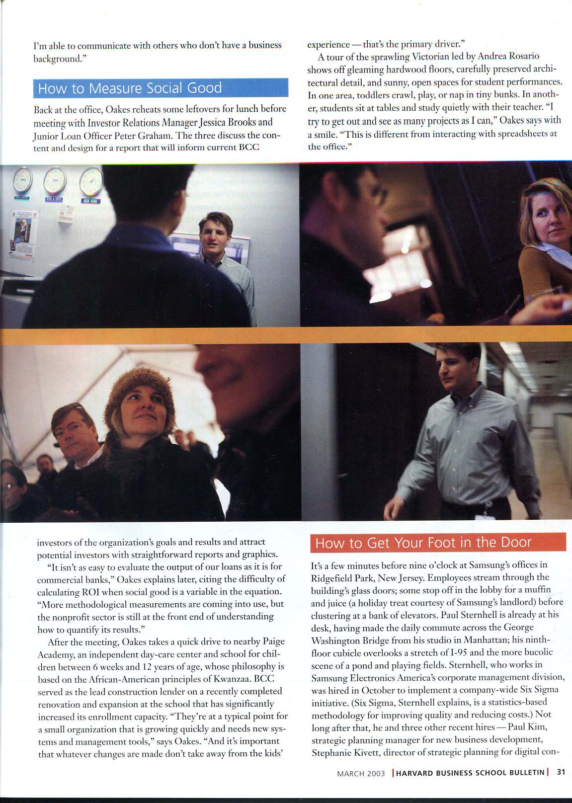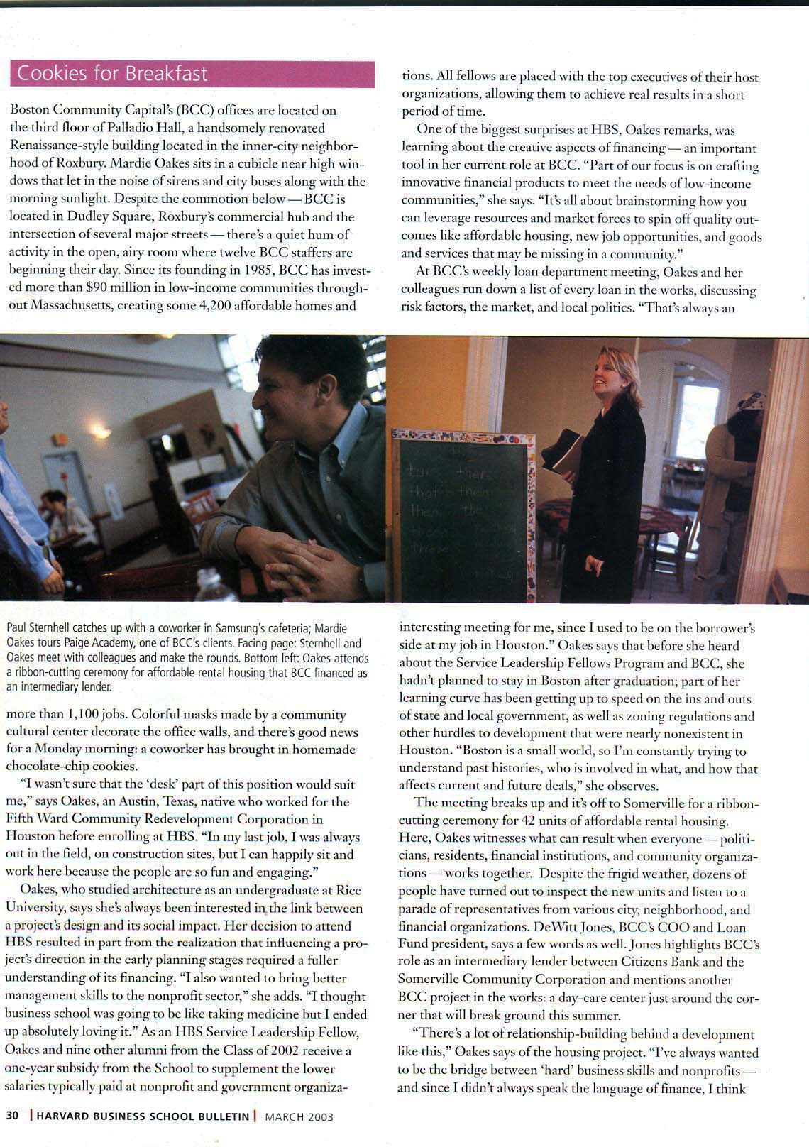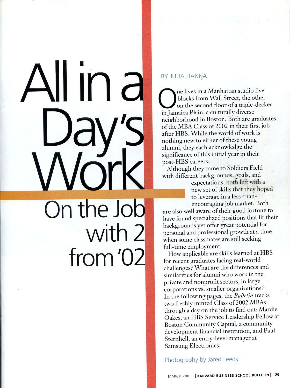 Harvard Business School Graduate's Portrait Project, 2002, (photo by Tony Deifell) Each year Harvard MBS graduates are asked to respond to the question, ""Tell me, what is it you plan to do with your one wild and precious life?" Mardie wrote, "In the sixth grade I wrote, 'If I had a million dollars I would buy a new wardrobe. I would get some Kalvin Klines and new sandles. I would wear all these things in Hawaii. I would stay at the most expensive hotel there is. I would get there in my jet plane. And I would go back on a cruise.' Taped onto the bottom, as if my parents insisted I give some of the money away, was "And I would give $100 each to a nursing home and an orphanage." Friends read these statements with disbelief and laughter; I intend to continue to invoke laughter that I once wrote those words. My work in affordable housing and community development is driven by my desire to foster dignity in all people, regardless of whether their talents are rewarded in the marketplace. I plan to create fabulous places and spaces where strong, healthy families, diverse neighbors, and innovative ideas can coexist to form vibrant, safe communities. I'll practice what I preach by treating my family with respect while encouraging that we remain open to new ideas. Discussions with those who view the world differently is where real growth occurs and surprising solutions come to light. I look forward to helping that light shine on everyone, brown or white, rich or poor, healthy or sick, lucky or not. And I promise to never tell my kids not to splash me in the pool so they won't mess up my hair." |