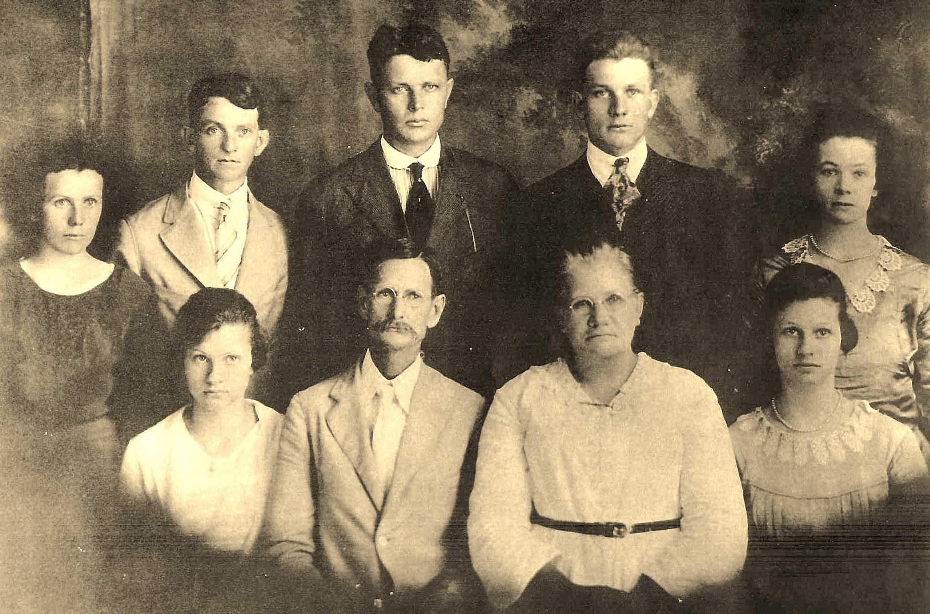 Samual Walter (1863-1937) and Anna Charity Rowe (1867-1947) Swinney family. Dating the photo: Stanley was a minister and with five children might have been exempt from WWII. Hiram, according to his death certificate, did not serve in the military, likely too young. WWI database does not contain any service for Payton though he is registered. Bessie the youngest girl appears at least 16, making the earliest for the photo is 1918. Standing L to R: Alva Ethel Swinney Ross (1893–1976), maybe Payton Cyrus Swinney (1892-1983), Stanley Clarence Swinney (1887–1965), Hiram Theodore Swinney (1899–1957), Mamie Ruth Swinney (1898-?). Sitting L to R: Dameris Maxine Swinney (1905–1982), Samuel Walter Swinney, Anna Charity Rowe Swinney, Bessie Olene Swinney (1902–1995) |