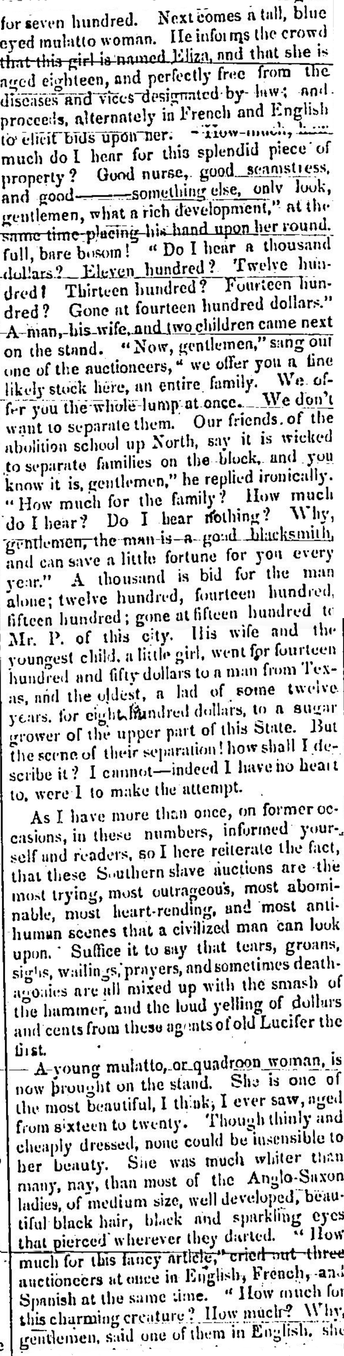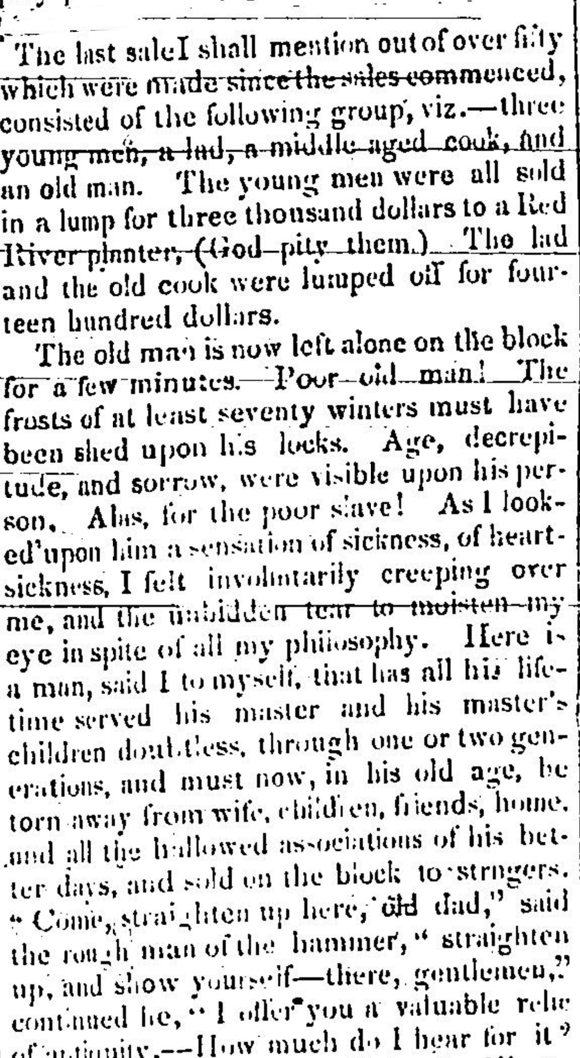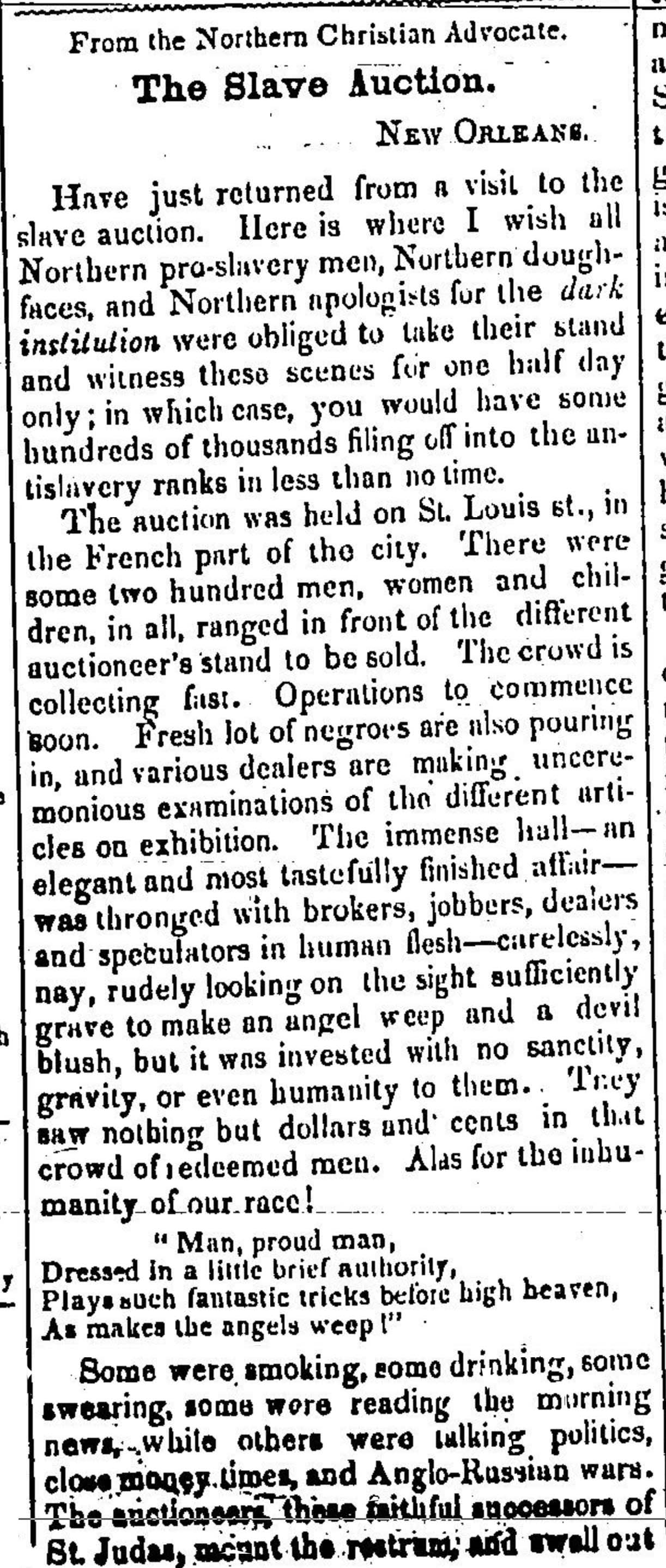 For those tempted to romanticize slavery and the Confederacy and those that fought to maintain this abominable institution, I encourage you to read this eye-witness account of a typical slave auction in New Orleans, and remember, this went on week after week, year after year. Remember that the people being auctioned share the same feelings and emotions that all of us feel. Put yourself in the barefeet of each of these individuals as each is humiliated in front of a crowd of white men. And as you do, ask yourself, "Do I really wish to revere and witness statues of individuals who fought to maintain this institution? Anyone with any heartcell left in their body would surely answer, "No!"