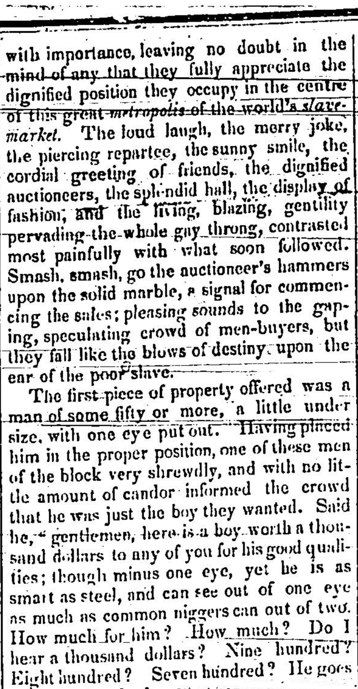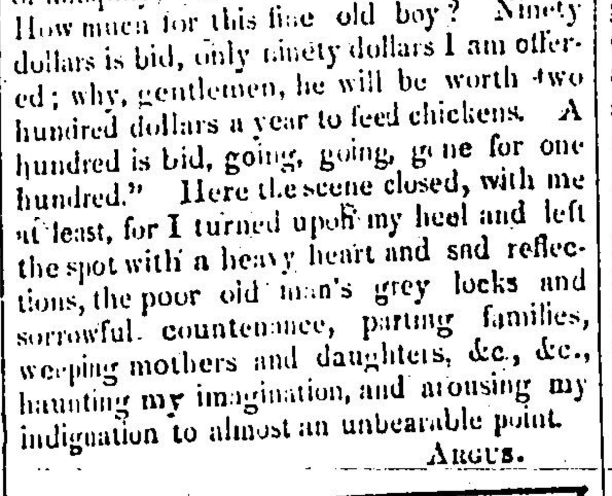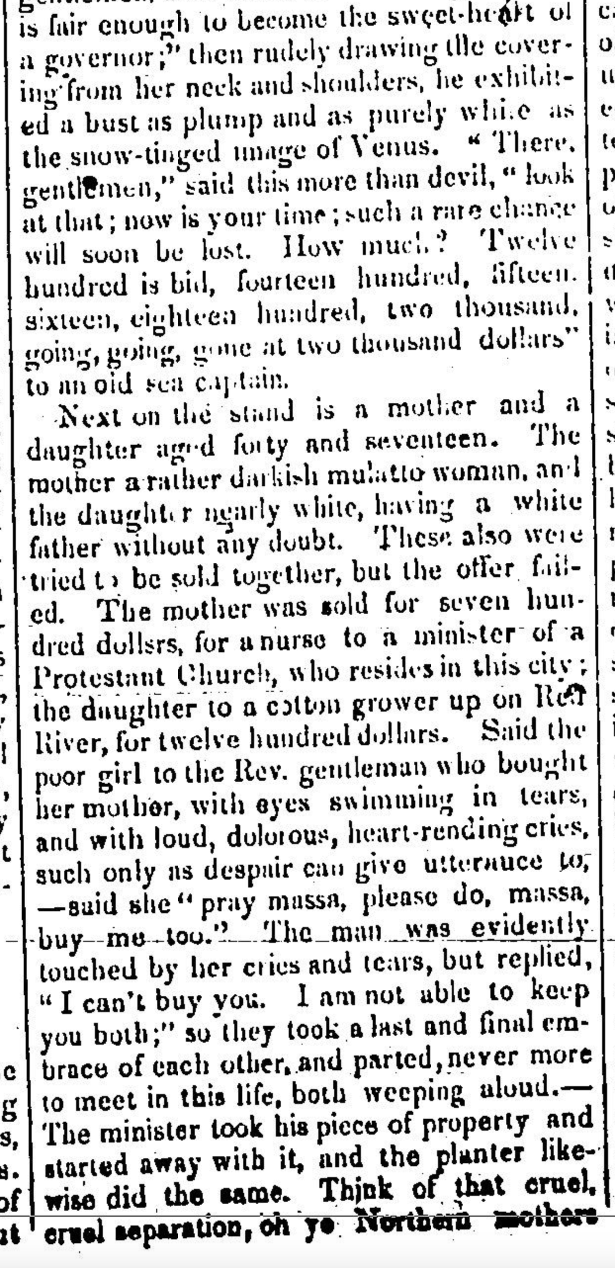 For those tempted to romanticize slavery and the Confederacy and those that fought to maintain this abominable institution, I encourage you to read this eye-witness account of a typical slave auction in New Orleans, and remember, this went on week after week, year after year. Remember that the people being auctioned share the same feelings and emotions that all of us feel. Put yourself in the barefeet of each of these individuals as each is humiliated in front of a crowd of white men. And as you do, ask yourself, "Do I really wish to revere and witness statues of individuals who fought to maintain this institution? Anyone with any heartcell left in their body would surely answer, "No!"