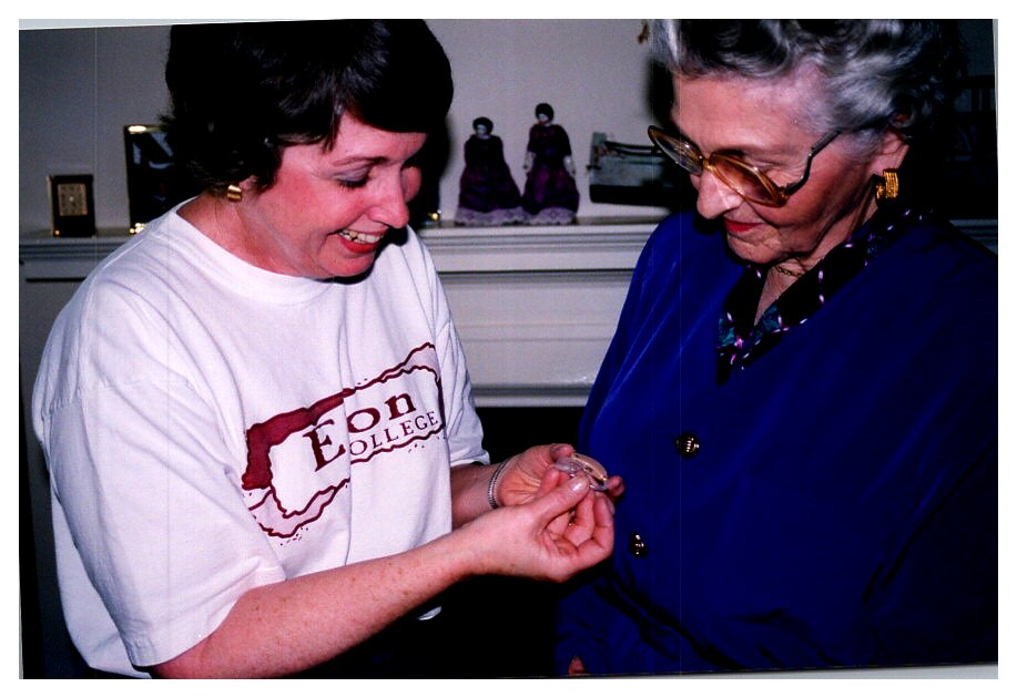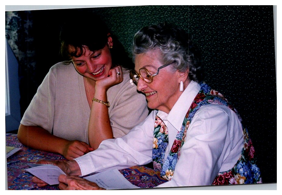 1998 June-July08 Sandy Heckman showing her mon, Lois Winter, her new hearing aids.