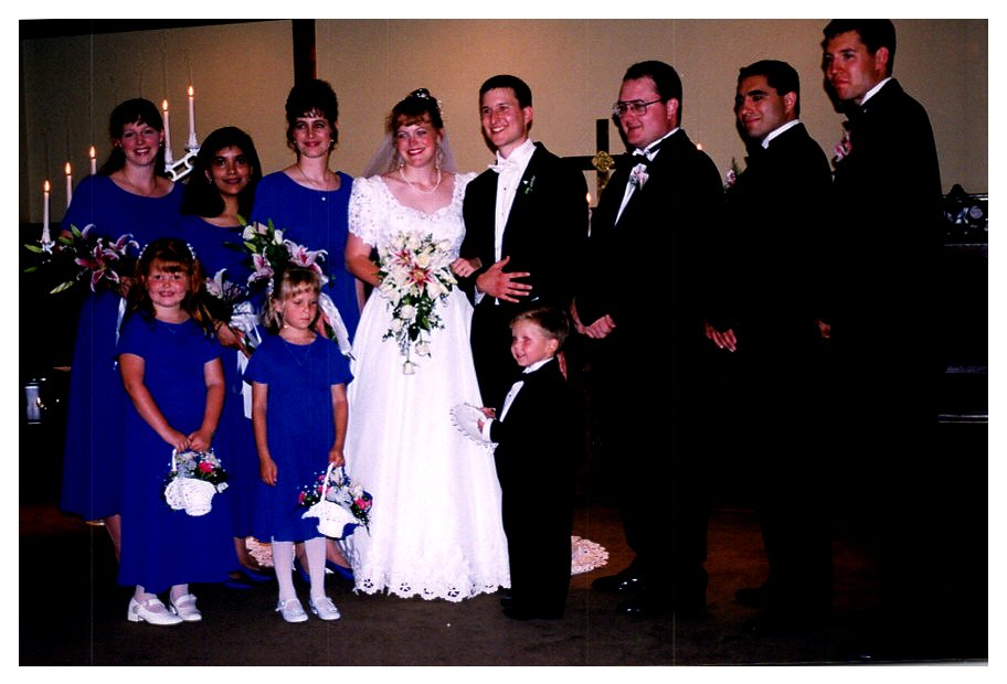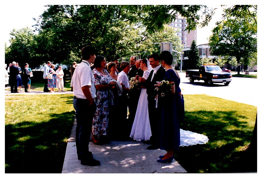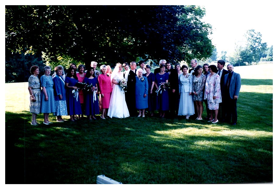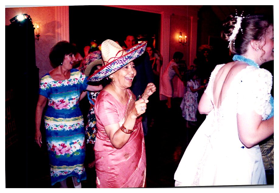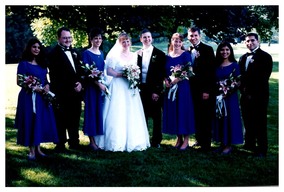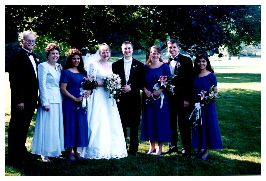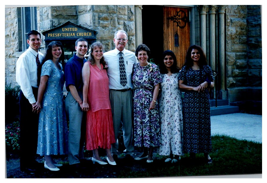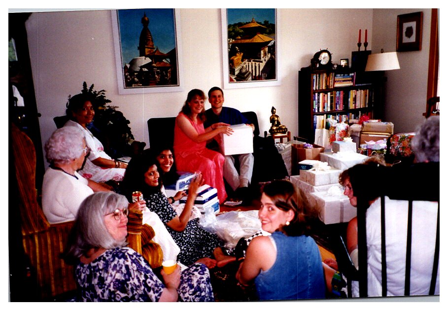 1998 June-July25 The Wedding Party, Kamala and Jay Johnson delayed by weather. Back; Allison, Pragya, Triicia Shaw, Shanti, Frank, Pete Rook, Vince Thompson, Jim Edgecomb.