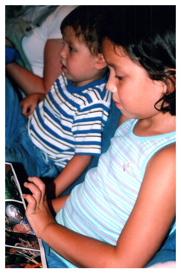 2007 Feb-Aug17 Etthan, Mel and Emily. Mel telling super hero stories.