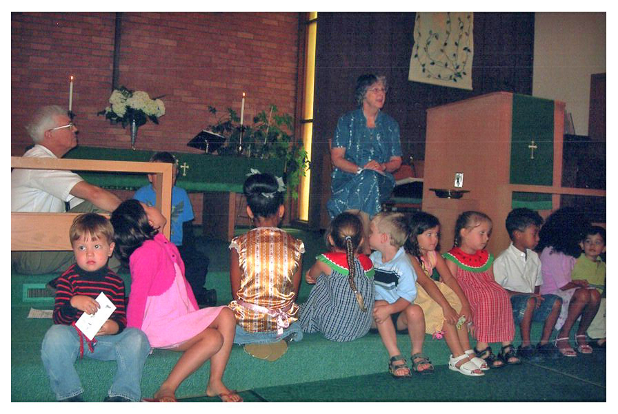 2007 Feb-Aug84 Children's Sermon by Pat Oakes, Aurora Methodist Church. Ethan, Emily, Aliyah, Lydia, Scott, Susanna, jaheim, Jada, Gaurav. Elton at left.