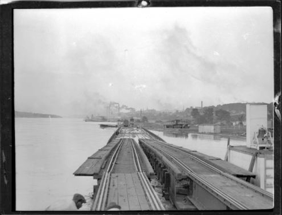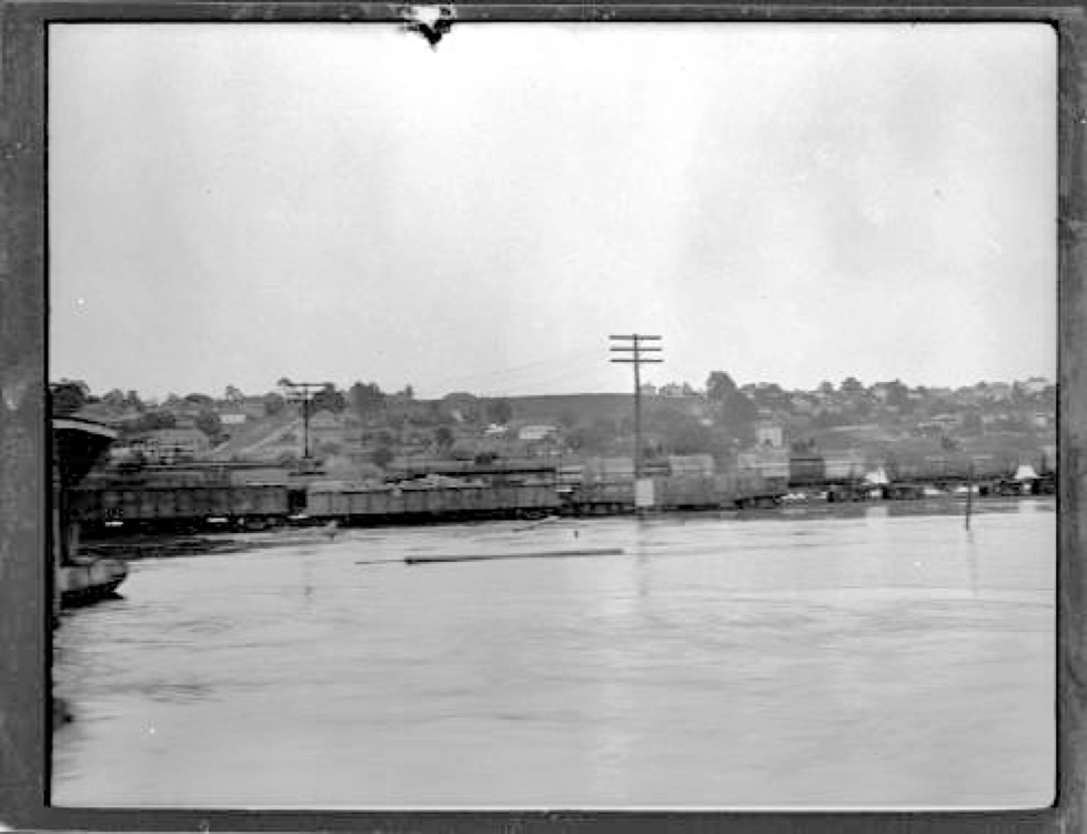 May 9, 1922 Vicksburg photo, This is year Fred Oakes came to Vicksburg. Camera looking along railroad tracks on piers near bank of the river which is flooded, with engine, rail cars and workers visible behind. In background are industrial buildings, tall smoking chimneys and some of the town buildings can be seen on the bluff.