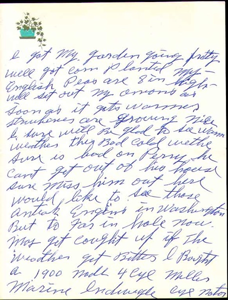 I got my garden going pretty well got corn planted my English peas are 8 in high-will set out my onions as soon as it gets warmer Strawberries are growing nice I sure will be glad to see warm weather the bad cold wethe sure is bad on Perry he cant get out of his house sure miss him out here would like to see those anteak engines in Washington but to far in the hole now. May get cought up if the weather get better i bought a 1900 modl 4 cyl Miller marine industrial? cyl motor for 15.00 will have it runing before long sure is a collectors idom