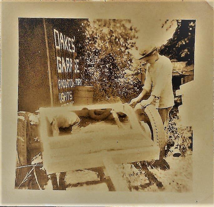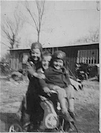 This photo from Mike Davis, Laura Annis Oakes Hull's grandson was taken in front of the first building of Oakes Auto Part on Highway 61 North. The boy at the right is Melvin Oakes, son of Fred and Margie Oakes. The person bending over, at the left is yet to be identified. The building seen with Oakes' Garage had a red color to it. There was a counter for meeting customers. That part was floored, however the quite large area behind had a dirt floor and shelving for storing auto parts. You can see the mullion windows of the building in the picture above of boys on tricycle. Mel Oakes is about 12-13, which would make the photo, 1948-49.