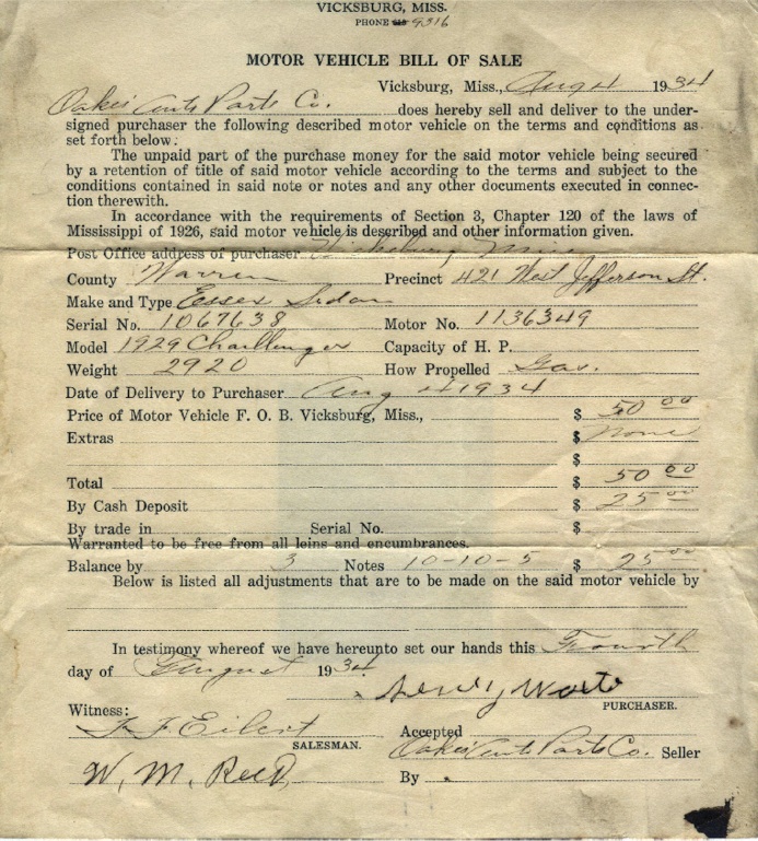 1934 bill of sale for a 1929 Essex Challenger. Sale was witnessed by W. M. Reed (wife Lela Reed), an employee of Oakes’ Auto Parts Co and Floyd F. Eilert (1900-68), a clerk in Waltersville. Eilert was called “Preacher.” Reed had worked for Miller Auto Co. Buyer might be “Henry Waite.” Here we show several examples of this car.