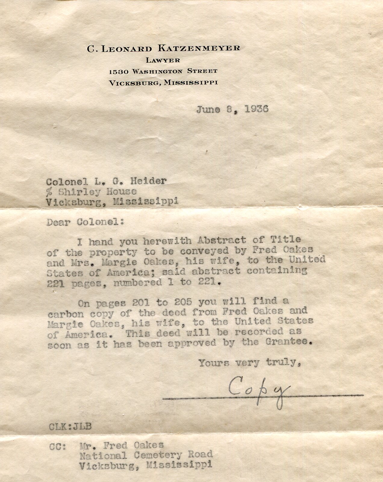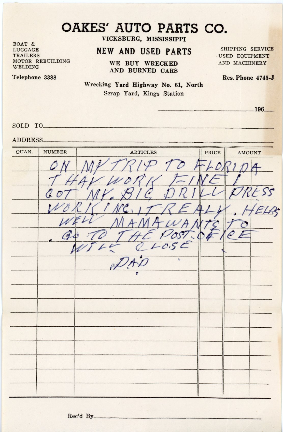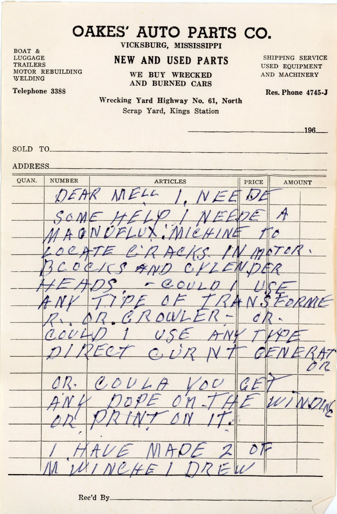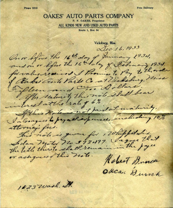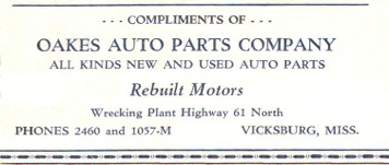 1938 July, Recording Deed from Frank R. Melsheimer, Jr. to J. G. Shepard, Chancery Clerk 1938 October 3, Fred Oakes signs a Deed of Trust with the First National Bank of Vicksburg for $1100. 1938 February, Gets approval from city to alter Mulberry Street Building 1939 Oakes Auto Parts, 1224 Mulberry, Resides Rt. 1 Box 54 1940 Moves to new home at Route 4 at Kings, Uses adjacent property as salvage yard for parts in his repair business. 1941 Oakes Auto Parts, Spring Service, 1224 Mulberry and 522 Clay St., Work Phone 2460; Home Phone, 1057 at Highway 61 North 1943 Fred and Margie executed a Deed of Trust for $1000 dollars using their two Kings properties as collateral. 1944 Oakes Auto Parts, Spring Service, 1224 Mulberry and 522 Clay St., Work Phone 2460; Home Phone 1057 at Highway 61 North, Residence Rt. 4, Box 95 1947 Fred and Margie executed a Deed of Trust for $1000 using their Mulberry and Clay Streets property as collateral. 1956 Fred and Margie executed a Deed of Trust for $3300 to buy property adjacent to property across railroad tracks. This property gave him frontage on the rail line. According to brother Donald, he hope to get a spur to load scrapiron and sell directly to foundries.