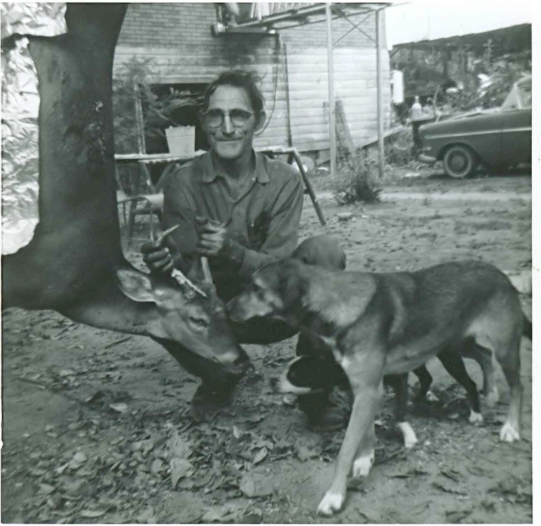 Curtiss Hicks: Curt was a long time and devoted employee. He lived in a small house at the back corner of the salvage yard. He was divorced and maybe had a daughter. He was always in good spirits and devoted to Fred. He never wore socks. He was patient with Fred's sons, alway willing to teach them about cars. He seemed able to do anything on the yard, weld, straighten wheel, make springs, build engines, etc. His tolerance for pain was amazing. He tested whether a spark plug was firing by grabbing the end of the wire with his bare hand. If he got a shock he was satisfied it was firing. His hand would jump every time the voltage his him. He let an engine fall on his hand once, he did not panic, he just said, "Where is that jack?' He reached for it, positioned it under the pan and jacked it off his hand and continued to work. He is pictured at right, about to dress a deer. In the background, we can see the walkway from the upstairs apartments that was built for the boys and Grandpa Oakes. He and Fred were going to Florida to rescue Mel Oakes' car which had thrown a rod. Margie Oakes bought Curt a pair of sock to wear. He dutifully put them on, however, when he returned from the first rest stop, Fred reported they had been removed and abandoned.
