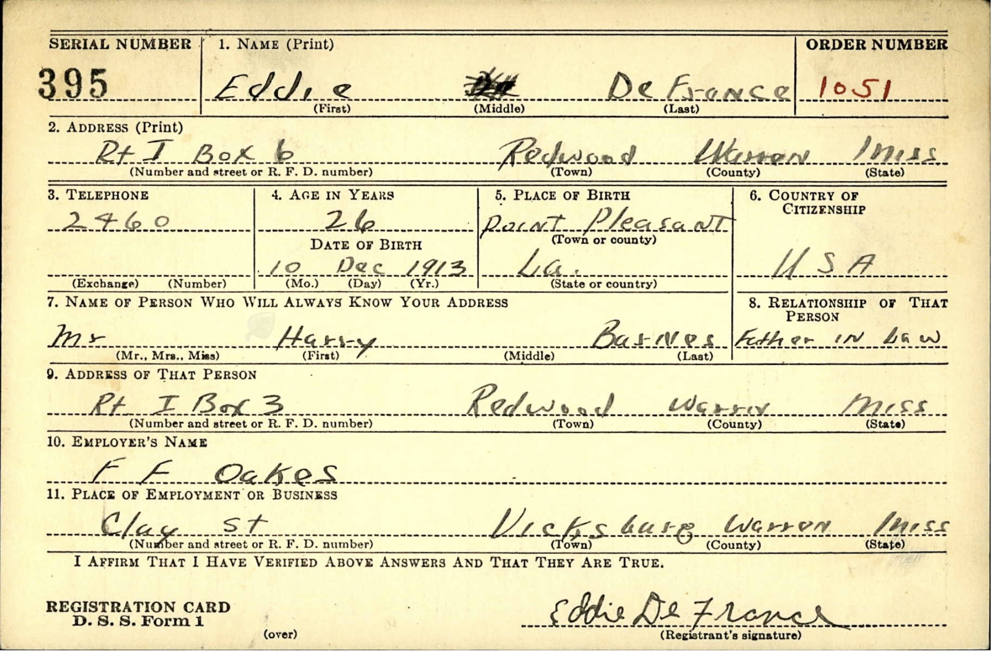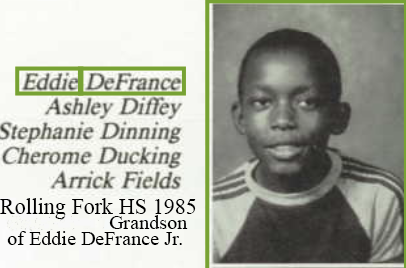 Eddie Lee DeFrance Sr., born December 10, 1913. Eddie was married to Everlena (or Eveline) Barnes De France. They had a son, Eddie DeFrance II, and three daughters, Barbara (Tuggle), Gloria Jean (King)(1946-Dec. 25, 2012),and Jacquelin (Young). Gloria Jean was married to Eugene H. King. Eddie died in Valley Park, MS in October 1986, at the age of 72. Eddie's son, Eddie Defrance II died in Vicksburg in February 2021. His obituary read. "A Celebration of Life will be held for Eddie DeFrance on Sunday, Feb. 20 at 10 a.m. at Christian Home No.2. DeFrance will lie in repose from 9 a.m. until the hour of service. Visitation will be held at Christian Horne No.2 on Saturday, Feb. 19 from 4 until 6 p.m. with family being present from 5 until 6 p.m. DeFrance was preceded in death by his son, Eddie DeFrance III; his father, Eddie DeFrance Sr.; his mother, Everlena DeFrance; two sisters, Gloria King and Barbara Tuggle. He leaves to cherish his memories a son, Lonnie Shelton; sister,