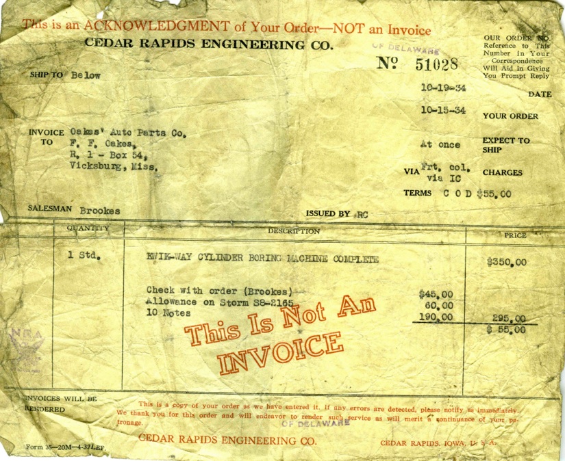 In order to do major engine rebuilds he would need something to rebore cylinders, grind valve and turn crankshafts. In 1934, he purchase a new cylinder boring machine. We see here the receipt for the $350 purchase. This would have especially expensive since this is during the depression. He could not pay cash, instead he traded in a machine, Storm 38-2165, puts $50 down and financed the remaining $190 over 10 maybe monthly payments.