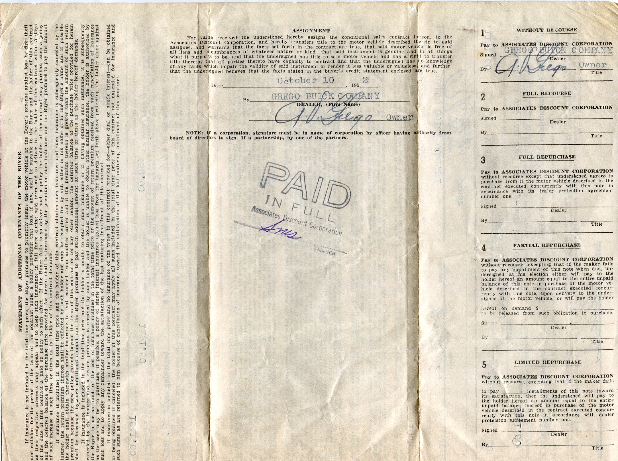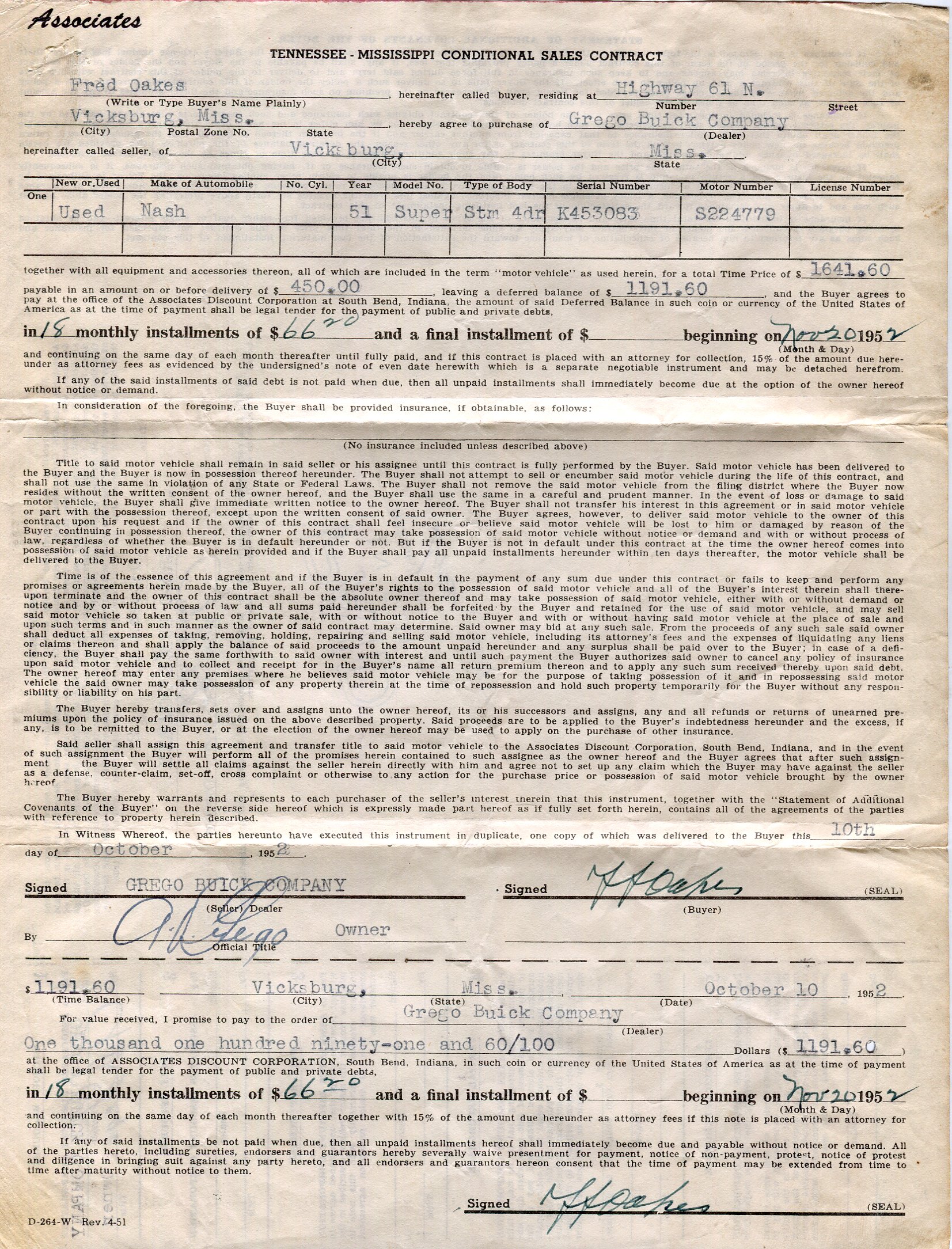 Bill of Sales for 51 Nash Statesman, purchased in 1952 for Mel Oakes, his first car. It had many problems sadly. It was generous thing for Fred Oakes to do for his son. Margie used it also.