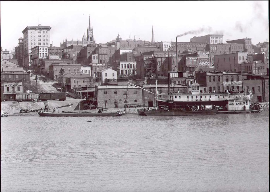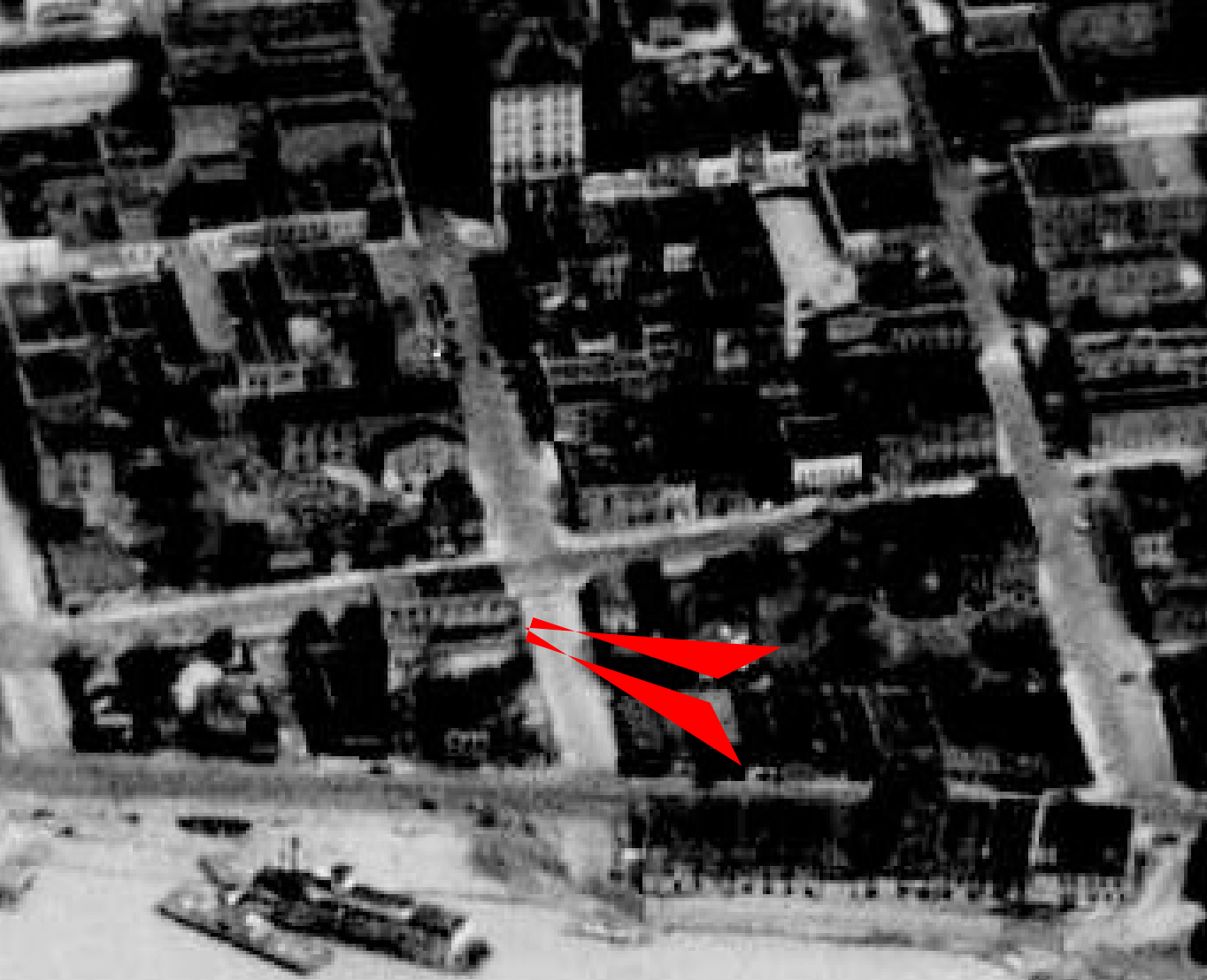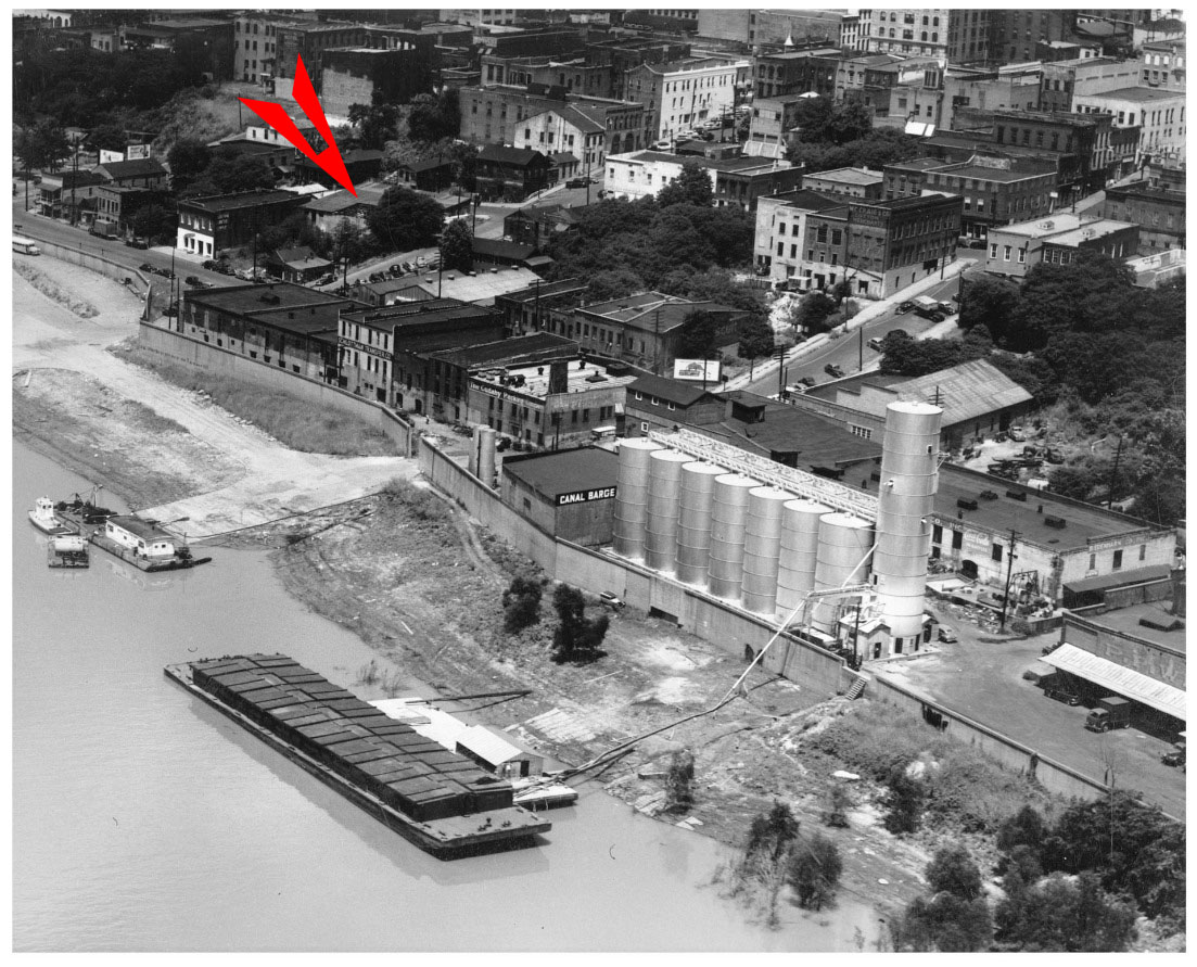 Vicksburg waterfront, 1940. Oakes Auto Part Building marked with arrow.