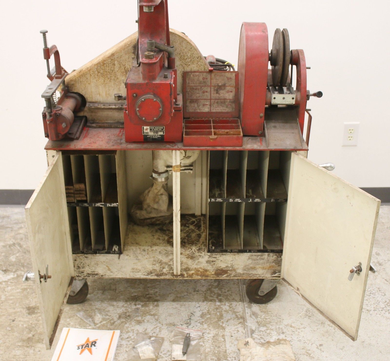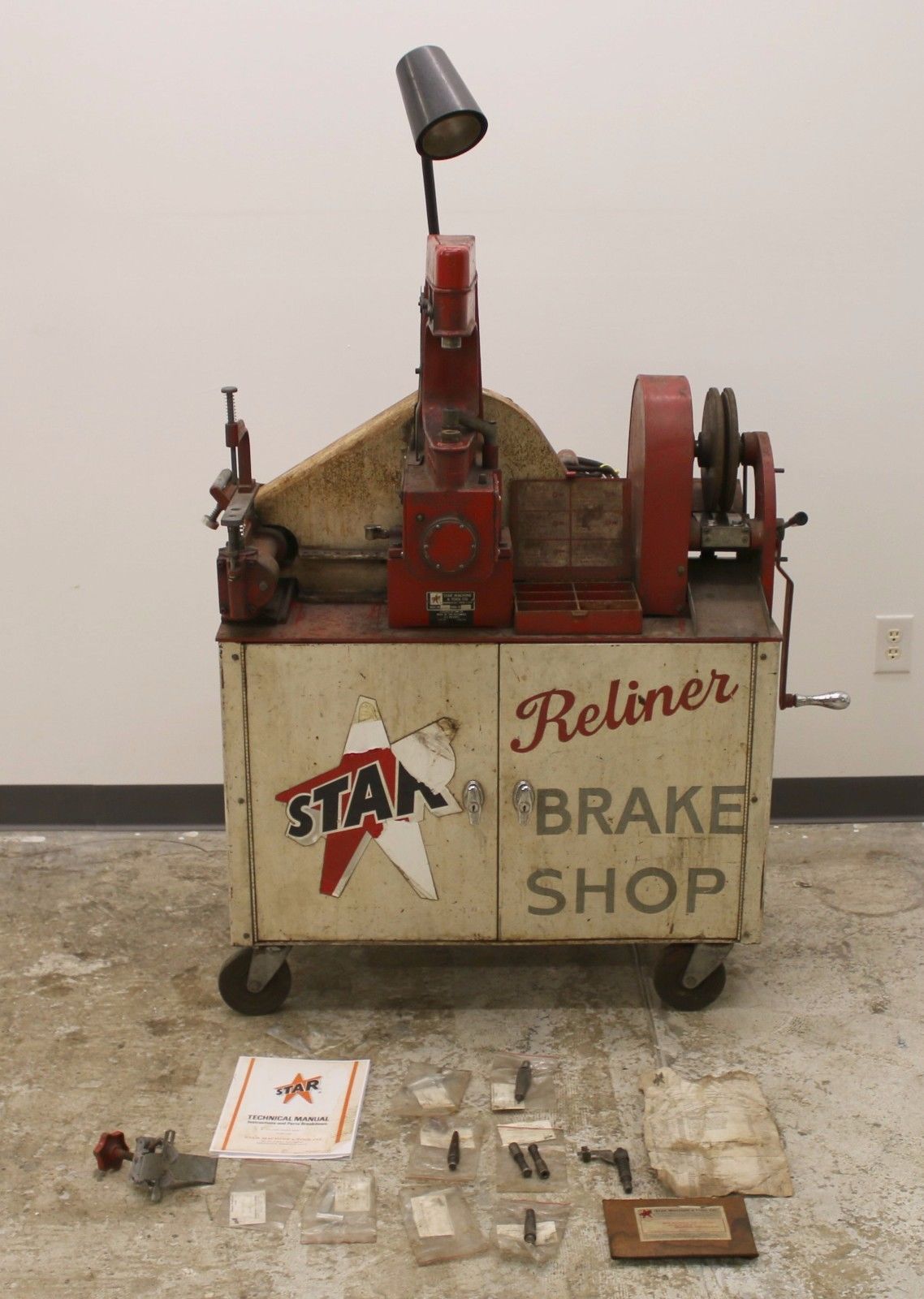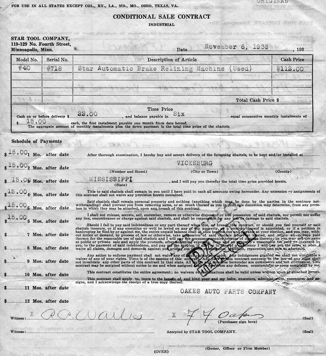 Tools were an essential part of Oakes Auto Parts. As the business grew Fred took on more variety of auto repair. Initially, he primarilty did small jobs not requiring much more than hand tools, however as automobiles became more complex and larger jobs were more profitable he need expensive tools. Where possible he would purchase used tools that were in good condition or that he could recondition. In November of 1933, he purchased for $112 a used Star Brake Reliner Machine, Model #40. Below is the sales document showing his financing arrangements. Also shown are photos of similar models.