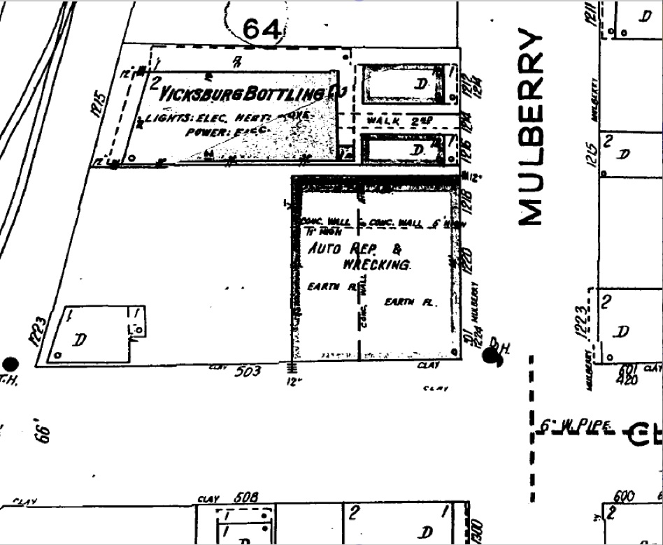 In 1930, C. Albert and Ada Graham, Arnold and Sarah Graham are living in "Garbish Quarters", described as "East from National Cemetery rd to Connecting Avenue. 2 south of U. S. National cenetery (houses irregularly numbered." A 1934 photo is shown at right. In 1935 Directory there are 23 homes in Garbish Quarters, 17 are listed as colored. On the map above you can see 20 or so homes along Garbish Avenue. Maybe they later moved to the big house. In 1930 30 Vicksburg Directory, Fred and Margie Oakes are listed Openwood Repair Shop, h26 Connecting Av. 1937 Fred and Margie Oakes, reside at Walters, MS, Oakes Auto Parts Co. West Side National Cemetery Rd, 1 South Mint Springs Bayou. 1938 January Fred executes a Deed of Trust to pay Frank R. Melsheimer Jr. $1100, for Mulberry property. In the picture above from maybe 1920s we can see the corner of the building on northwest corner of Mulberry and Clay street that Fred and Margie Oakes would later buy. You see that the building had a second floor. Leaning against the building is a giant wheel that could be used for driving machinery. In the picture below, we can see the top of this building at extreme left above the white building marked Saloon. Melsheimer, as a condition of purchase, removed the four-window top floor and took it with him. Fred roofed the lower floor. This is a view looking up Clay Street in the 1910. See a large panorama version of the photo below VicksburgPanorama1910