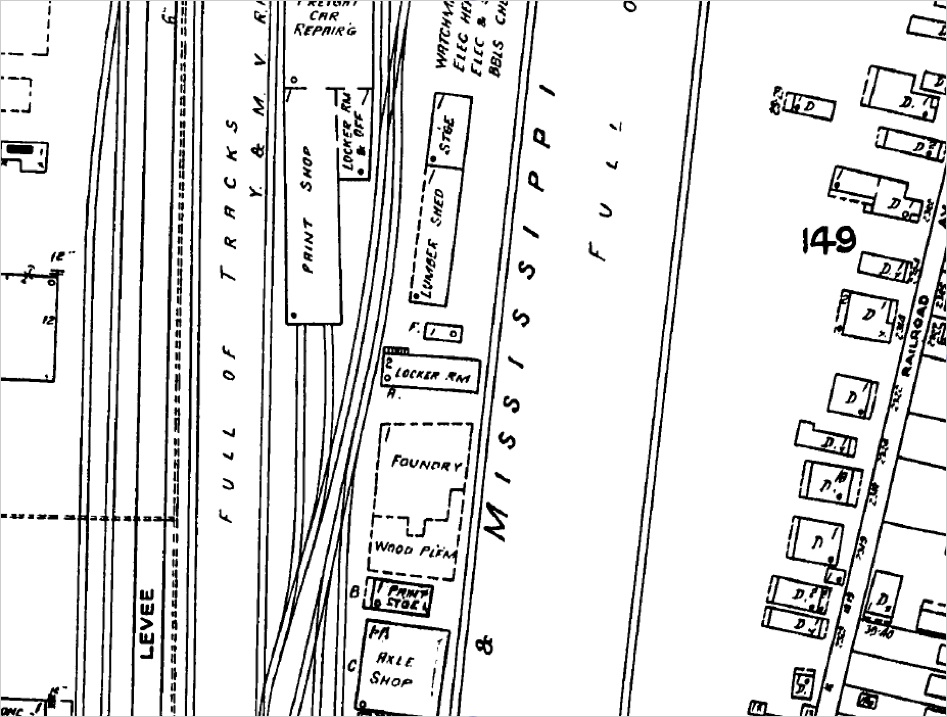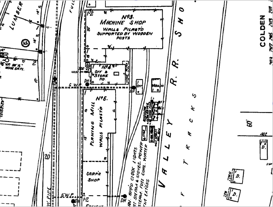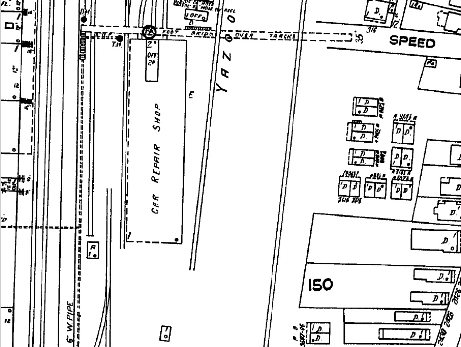 Views of the Y & M V Railroad Yard where Fred Oakes and later his father, Charlie Oakes, worked. Fred likely in the Car Repair Shop nad Charlie in the Carpenter Shop. These are from 1925 Sanborn Fire Insurance Maps