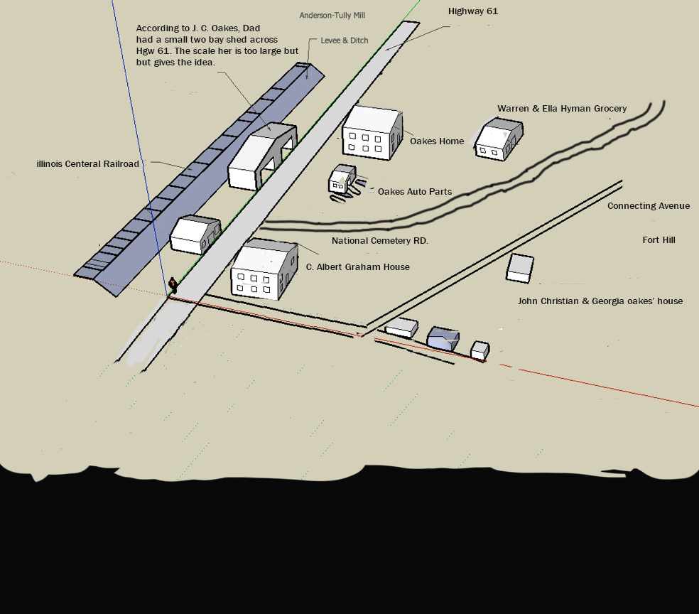 In the above 1930 Park Service Survey map you can see four buildings in the area where Oakes Auto Parts would move to. The long building under the number 338 would appear to be their future home. However the 1930 US Census would suggest otherwise. In 1930 at this address three families live in the building. Edward Lee and Minnie Hartley, their seven children and Edward Lee's sister Aileen. Also in the house is Columbus Albert and Ada Graham and their seven children. Also in the house is Jones and Ella Conrad and their five children and Jones' mother Ophelia. Clearly this requires a large structure and would suggest the large house under the 338 number. The shape of the three upper buildings match the aerial photo of the area. If the dotted road is in fact National Cemetery Road then the building appears to be on the wrong side of the road. (Note: In the 1935 Vicksburg Directory that I have, the entry for C. Albert and Ada Graham has an penciled X on it as if this is an error.) The 1935 Vicksburg Directory has Morris Lustberg store at 107 National Cemetery Rd. It has Oakes Auto Parts at ws National Cemetery Rd 1 s Mingt Springs Bayou.