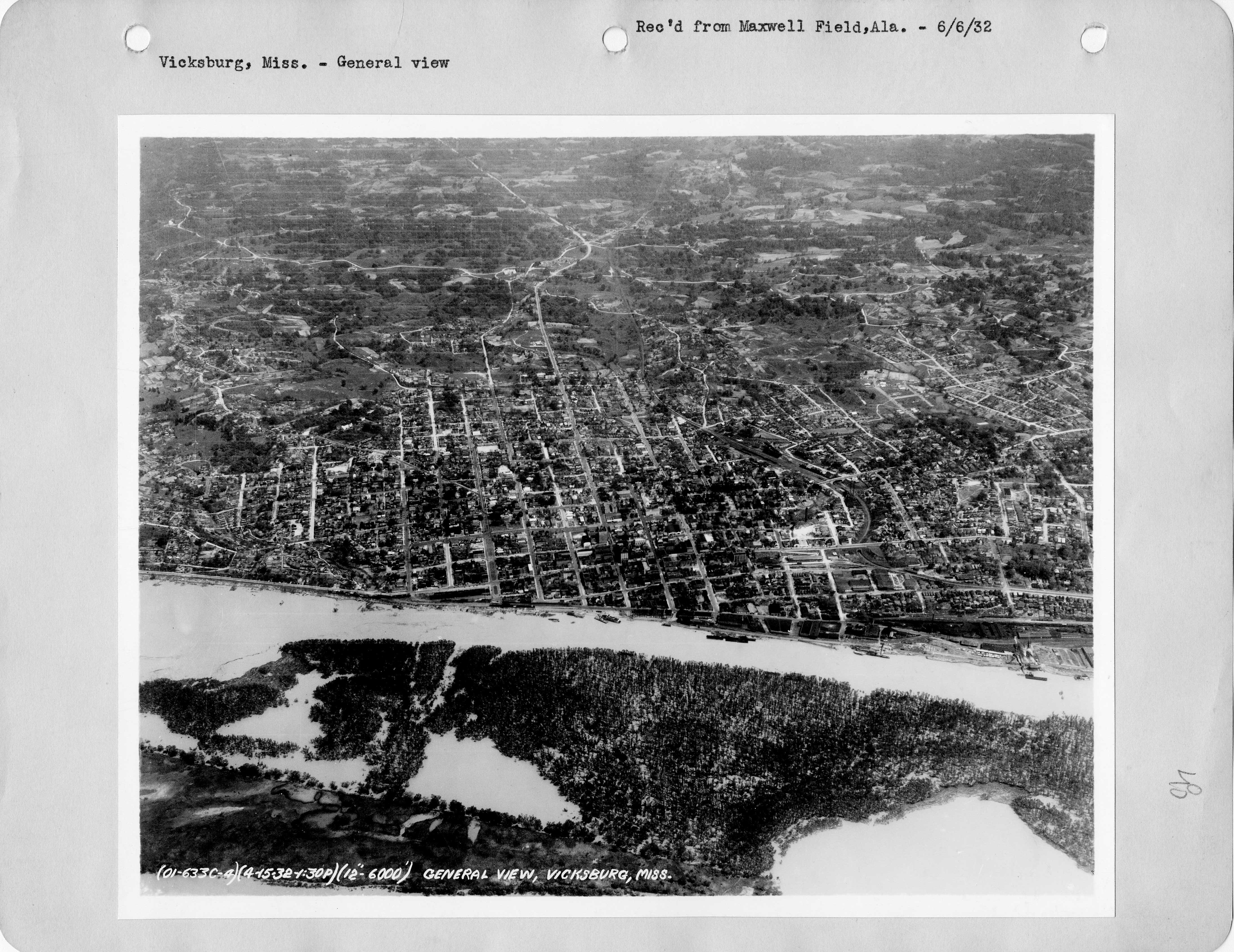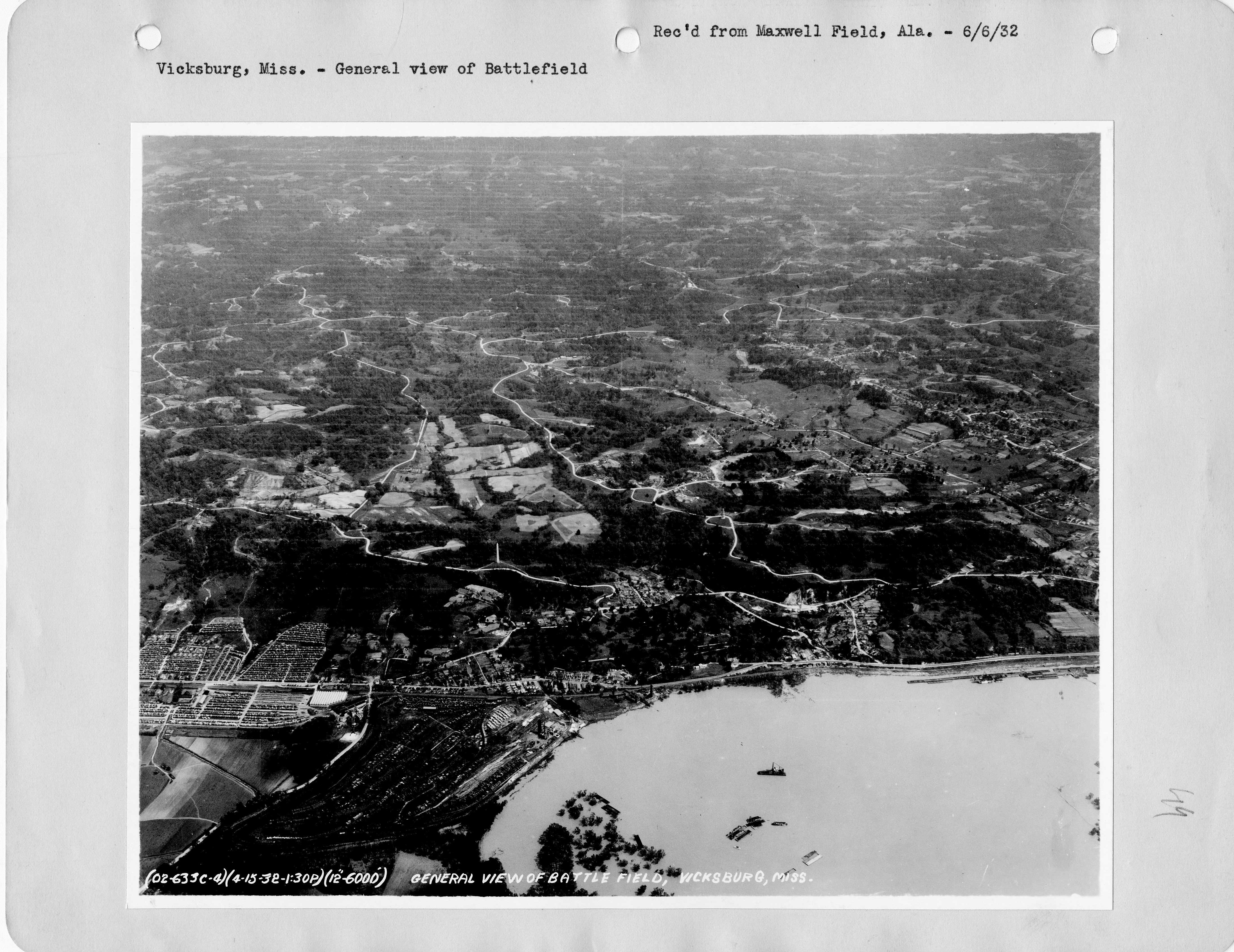 1932 Above is a 1932 aerial photo of Vicksburg. Unfortunately it does not extend enought north (left side) to reach the National Cemetery where Oakes Auto Parts and the Oakes home would locate in 1934. However, zooming in, one can see the building at Mulberry and Clay street that they would buy in 1938. A larger version of the photo is at Vicksburg Aerial Photo 1932