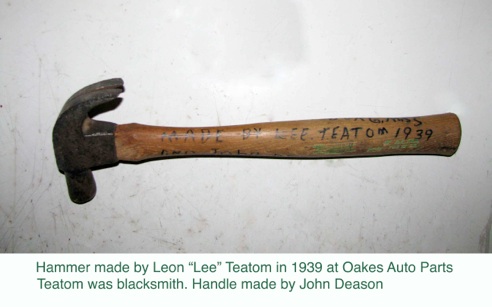 Leon Teatom (Teedom) (1890-1955) Wife was named Nettie. In 1918, he registered for the draft and was working as a blacksmith for the Y & MV Railroad which is probably where Fred Oakes met him. He was described as tall and slender and suffered from rheumatism. He and his wife and child lived in Jonestown, a black section of Vicksburg. He was still a blacksmith in 1929 living in Jonestown. In 1930, he worked in a railroad shop. He and Nettie had a son, James W. (14) and two daughters, Lillian (7) and Rosalee (5). They owned their $600 home. The hammer at right shows he worked at Oakes Auto Parts during 1939. He probably made the head and John Deason the handle. Leon is buried in Tates Cemetery. Cemetery notes and/or description: