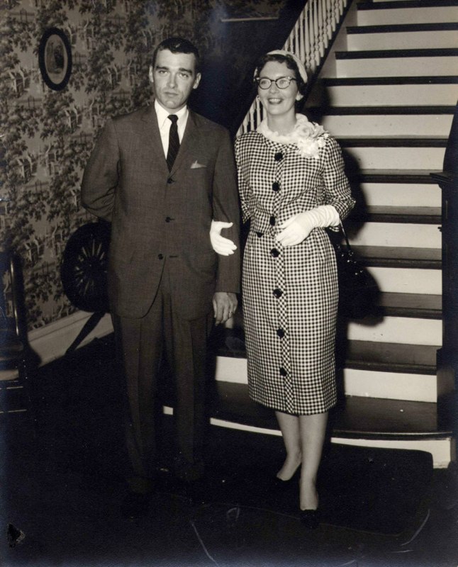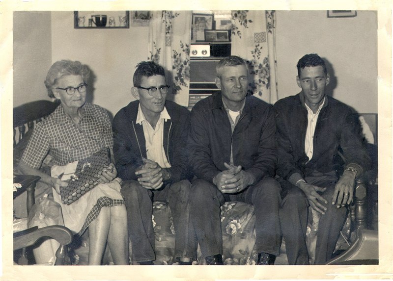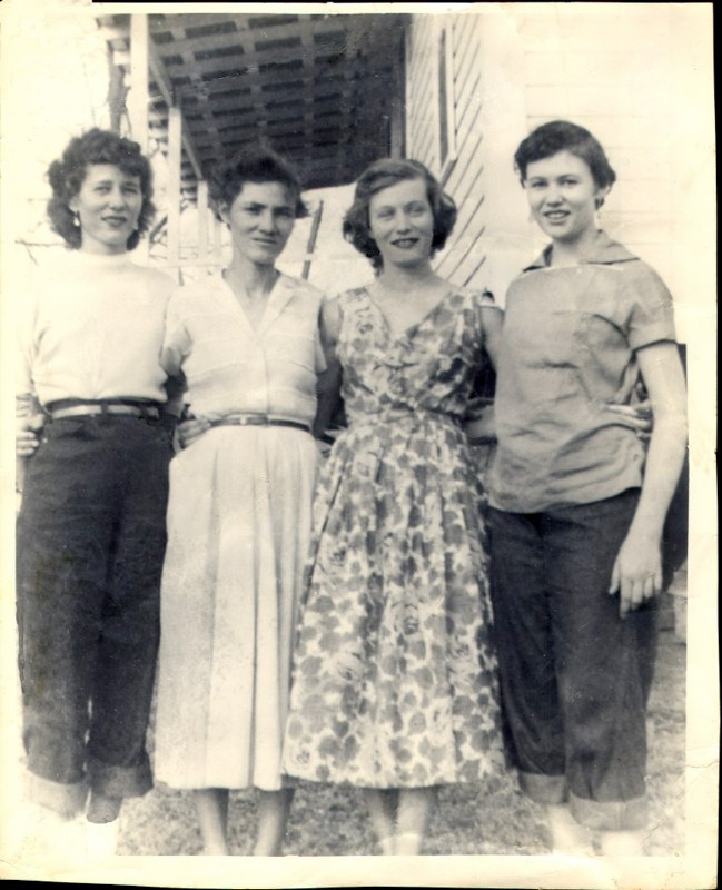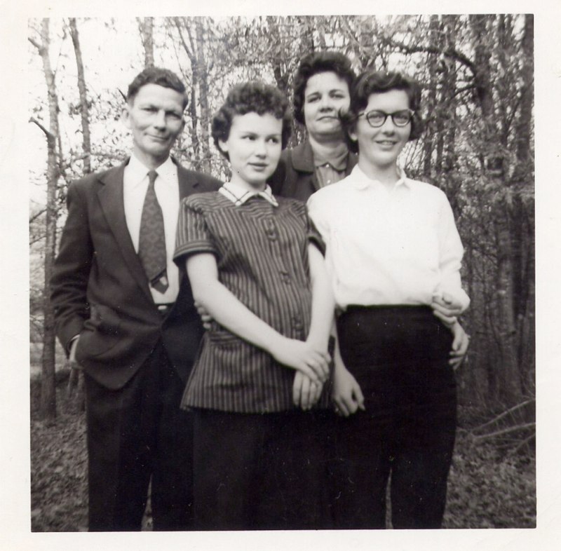 Back: Haman & Ethel Hill, Front: Pregnant Jeanine Bradley Rhymes, Frances Clark, college student |