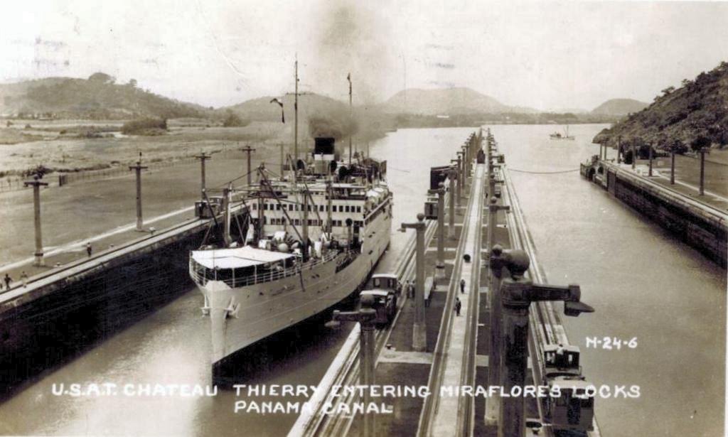 USAT Chateau Thierry underway in the Panama Canal, entering Miraflores Locks in 1936. This is the way the ship would have looked when Orel was aboard in 1937. Before being turned over to the US Navy in 1941, the ship made over 140 coast to coast voyages.