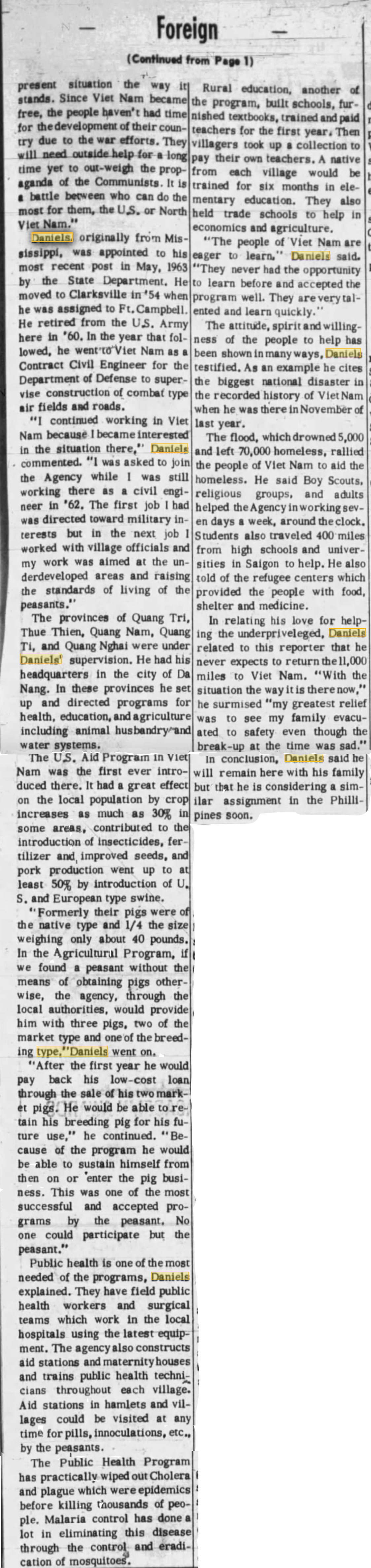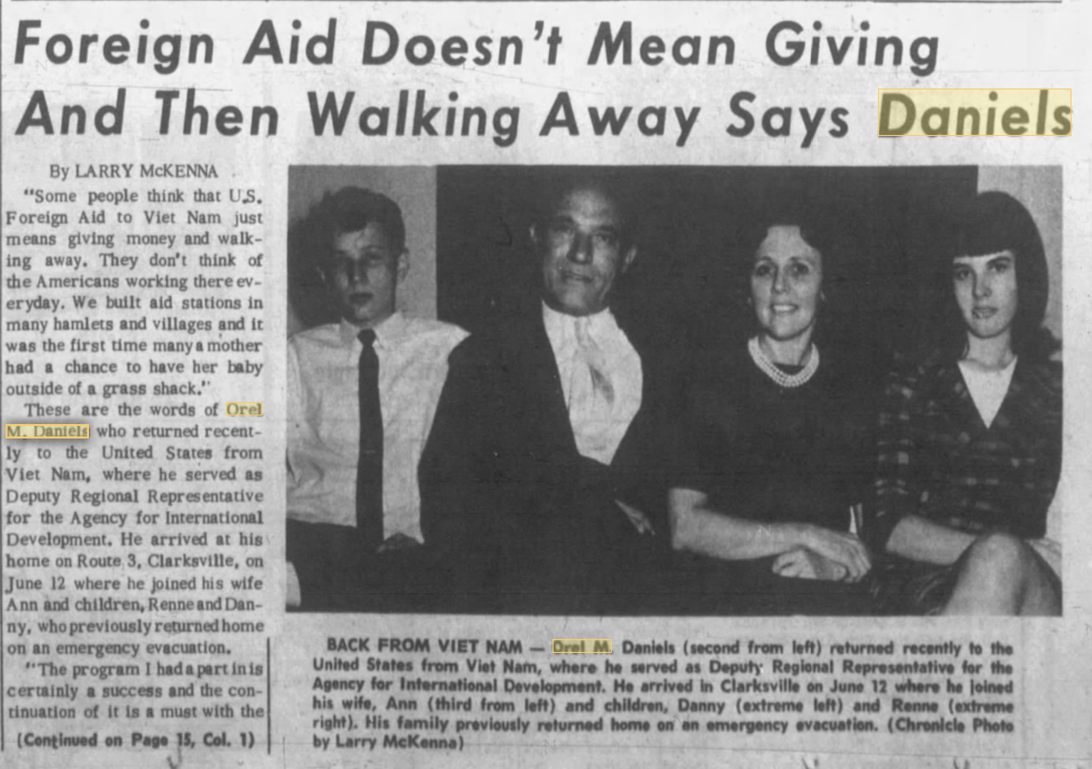 Captain Daniels was in VietNam from 1957 to 1966, first assigned there with the U.S. Army Corps of Engineers.