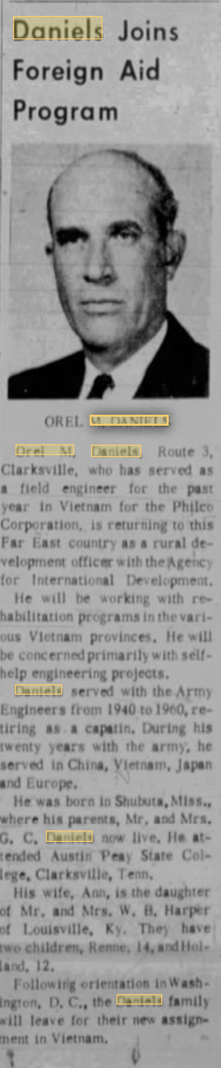 For some period before his retirement in 1960, Orel was assigned to Vietnam. This was prior to the war. After retiring, he worked as a contract civil engineer for the Department of Defense, building combat airfields and roads. He worked for the Philco Corporation as a field engineer from 1962-1963 in Vietnam. In June of 1963, he was with the State Department in Saigon, Viet-Nam, this was prior to the conflict. He was serving as an Operations Officer with the Agency of International Developement. He worked with rehabilitation programs in the various Vietnam provinces. He was concerned with self-help engineering projects. (From "The Leaf-Chronicle", Clarksville, TN, June 14, 1963.)