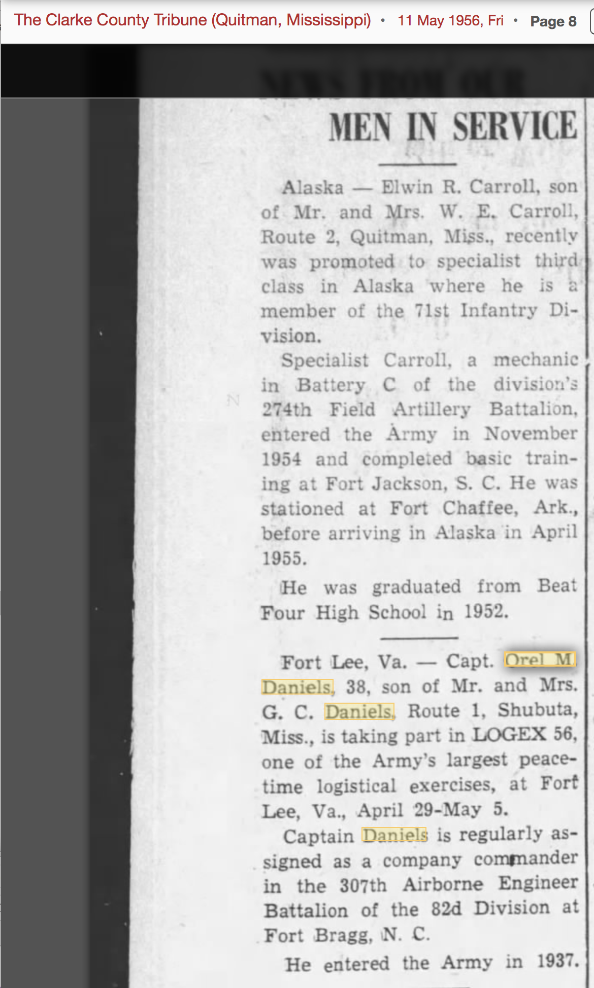 In the May 11, 1956 Clarke County Tribune (Quitman MS), it is reported from Fort Lee, VA that Captain Orel M. Daniels, age 38, is taking part in LOGEX 56, one of the Army's largest peacetime logistical exercises, at Fort Lee, VA, April 29–May 5. It says, "Captain Daniels is regularly assigned as a company commander in the 307th Airborne Engineer Battalion of the 82d Division at Fort Bragg, NC. He entered the Army in 1937."