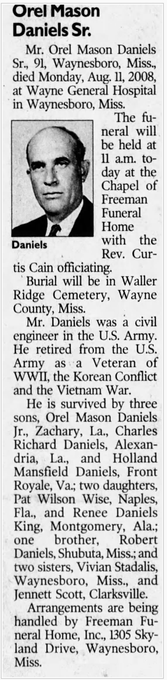 Orel Mason Daniels Sr., died at the age 91, of Waynesboro, funeral services were held at 11 a.m., Friday, Aug. 15, 2008, at the Freeman Funeral Home Chapel, with the Rev. Curtis Cain officiating. Interment followed at Waller Ridge Cemetery in Wayne County. Visitation was held from 5 to 9 p.m., Thursday, Aug. 14, 2008, at Freeman Funeral Home in Waynesboro. Daniels was a retired civil engineer in the U.S. Army and was a veteran of World War II, the Korean Conflict and the Vietnam War. He died Monday, Aug. 11, 2008, at Wayne General Hospital in Waynesboro. Survivors include three sons, Orel Mason Daniels Jr., of Zachary, La., Charles Richard Daniels of Alexandria, La., and Holland Mansfield Daniels of Front Royale, Va.; two daughters, Pat Wilson Wise of Naples, Fla., and Renee Daniels King of Montgomery, Ala.; a brother, Robert Daniels of Shubuta; and two sisters, Vivian Stadalis of Waynesboro and Jennett Scott of Clarksville, Tenn. Freeman Funeral Home of Waynesboro is in charge of arrangements.