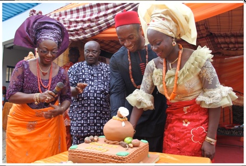 Chieze Ibeneche, Andy Nnewihe cutting cake at traditional wedding, |