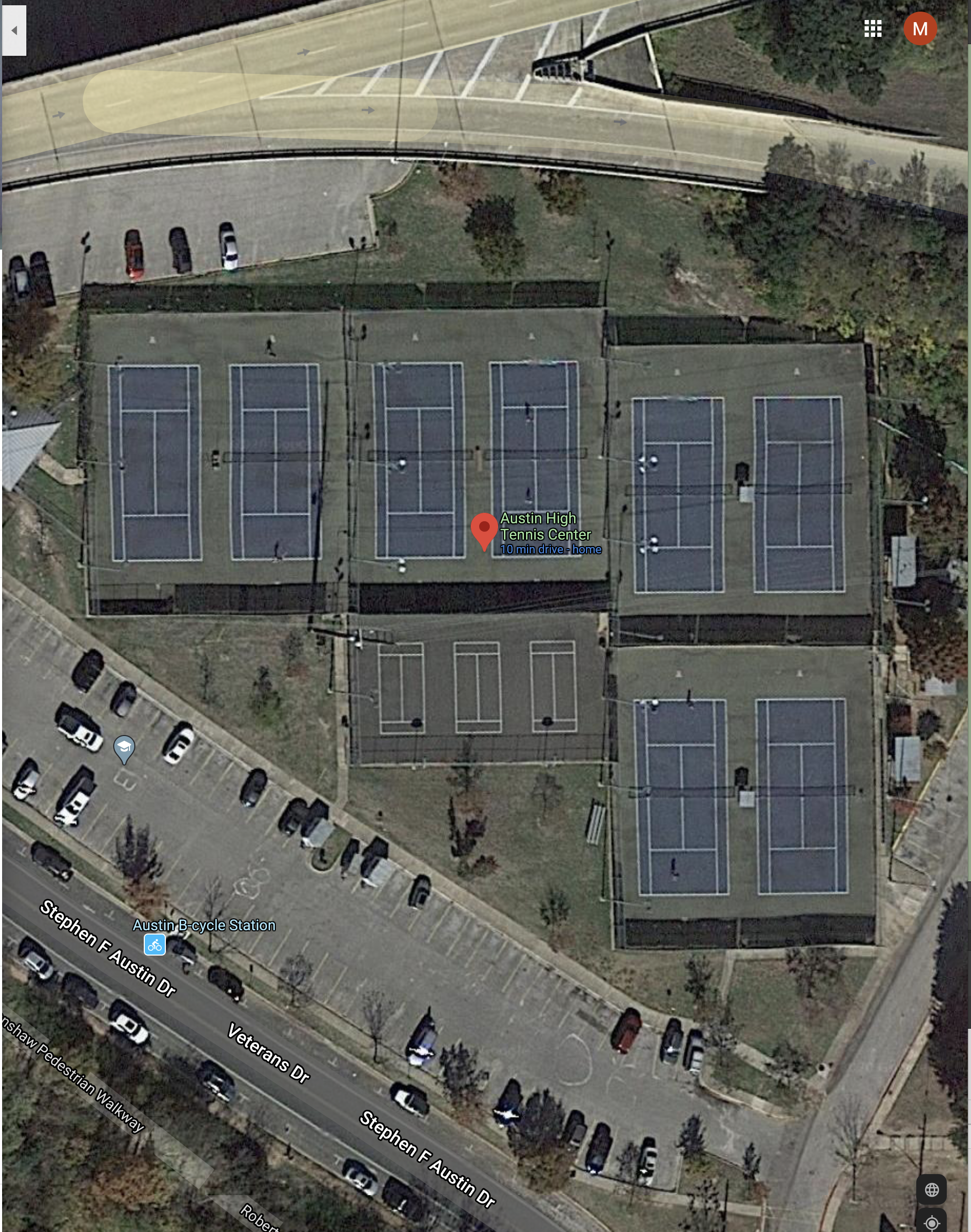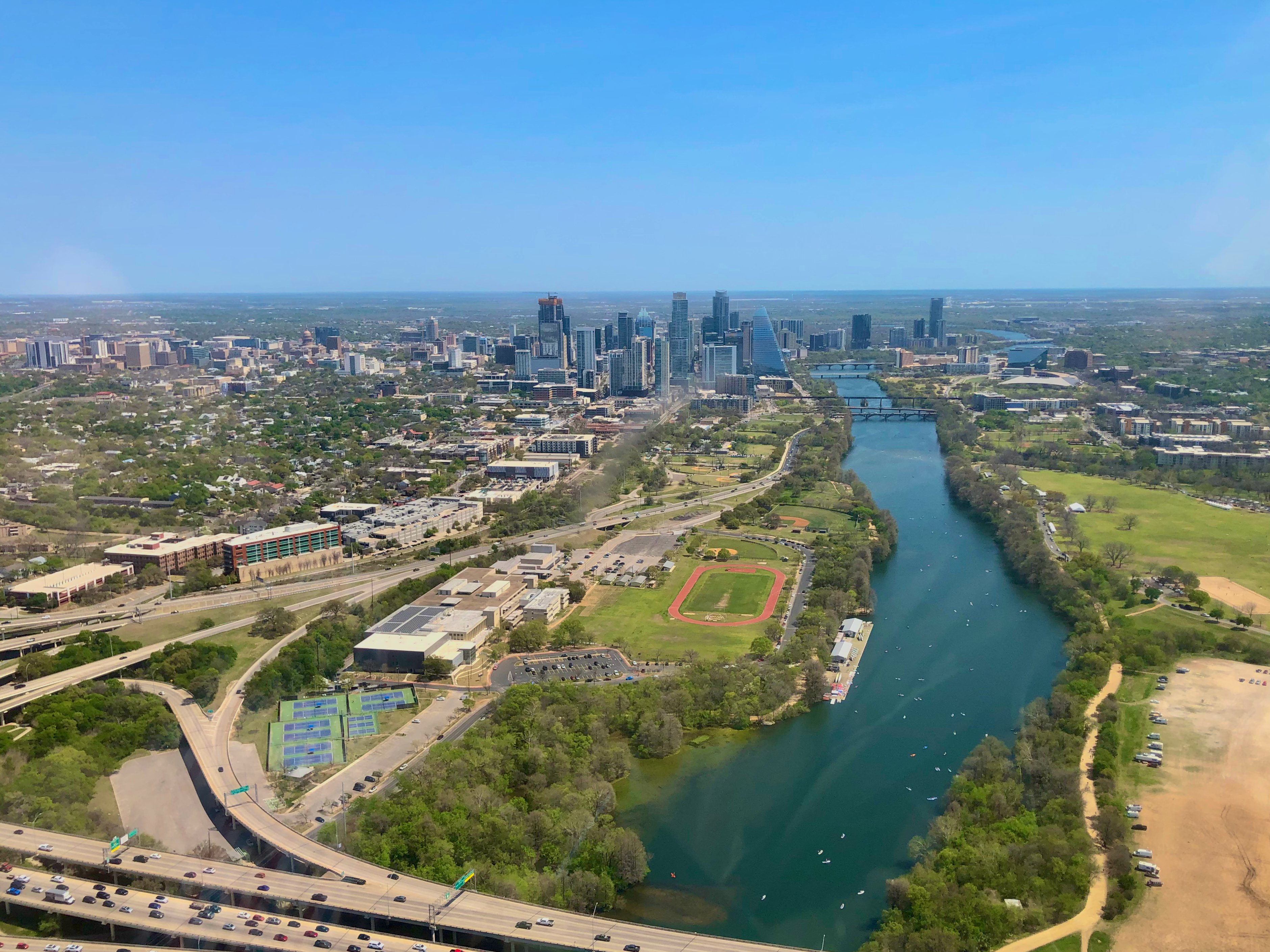 Here we see the Austin High tennis courts, lower left. Photo taken during a helicopter ride by Dan and Kim Updegrove. April 1, 2022.