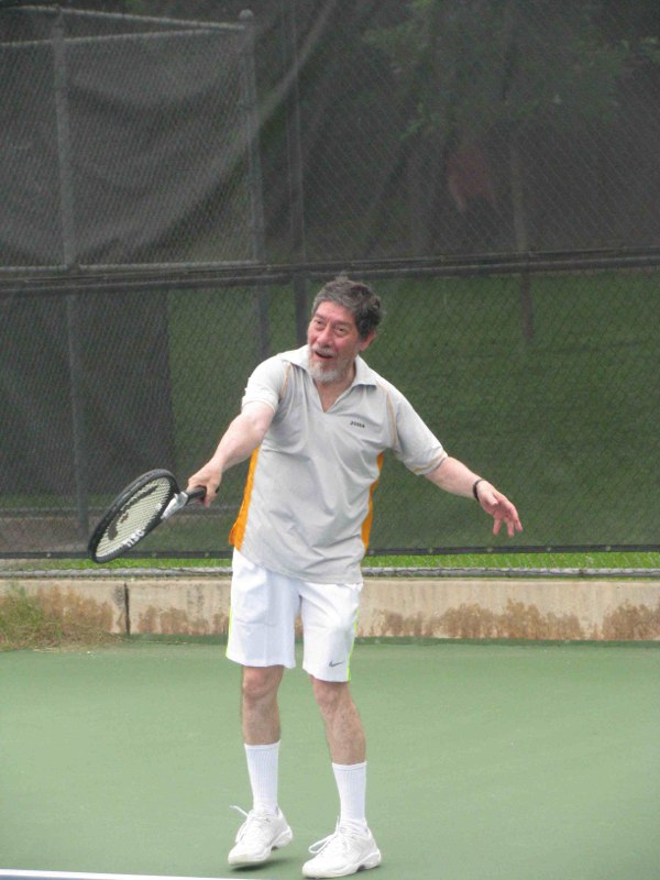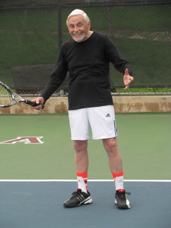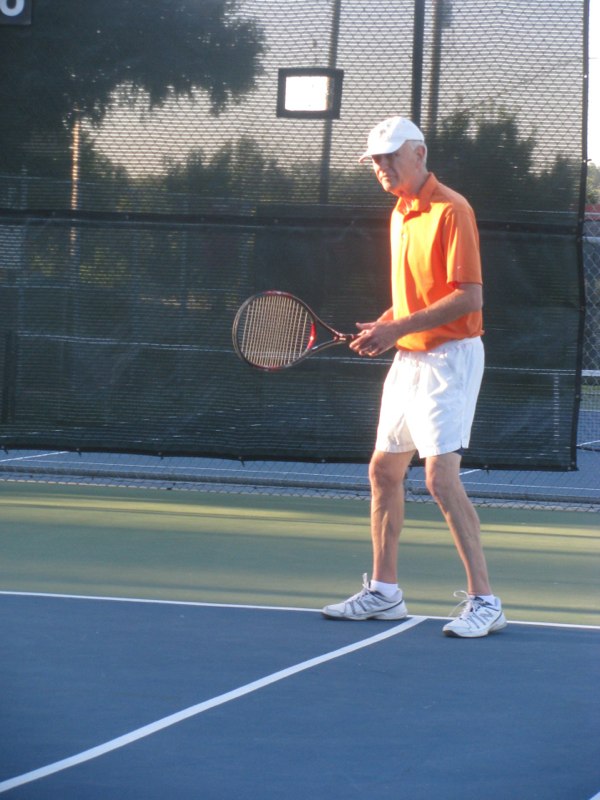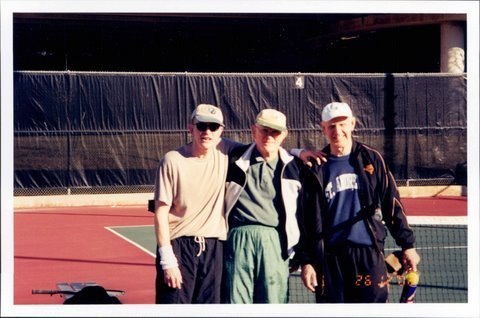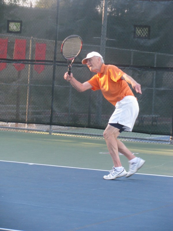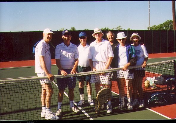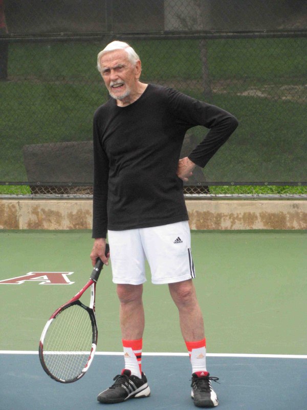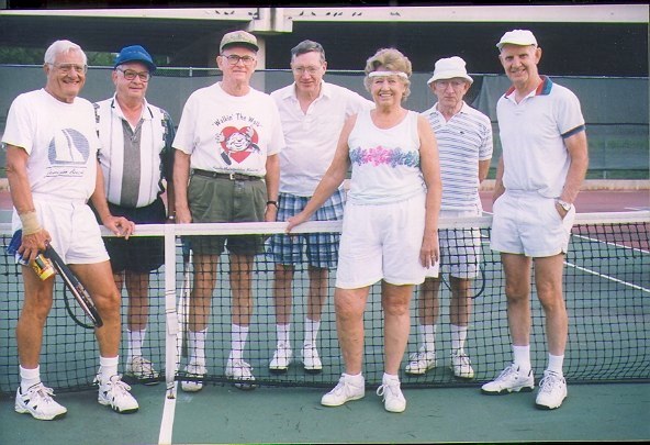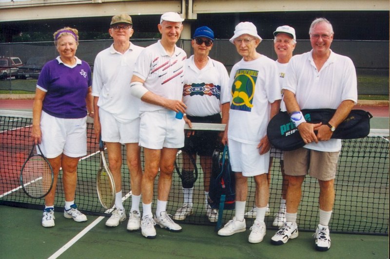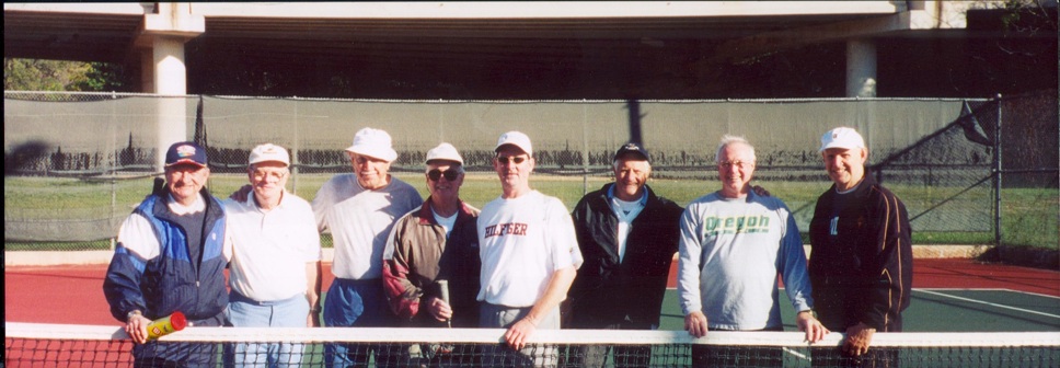 In 1974, Mel Oakes expressed his boredom with jogging to a seven months pregnant neighbor, Donna Jobe. She quickly suggested that he consider tennis. Since he had never played, she loaned him a racquet and took him over to the courts at Zilker School and showed him a few strokes, fortunately avoiding a premature delivery. He was hooked. A Guatemalan graduate student in physics at The University of Texas, Carlos Cajas, offered to hit with him on Saturday mornings, which they did for several years while Carlos completed his dissertation. John Towery and Garry Cole, minister and member respectively of the Congregational Church of Austin, both mentioned that they played and maybe we could have a match sometime. Garry, a professor in the UT Botany Department, enlisted Tom Mabry, then chairman, to play with us. We played at 7:30 AM Tuesdays and Thursdays at the 51st Street UT Inter-mural Courts. Eventually Tom Mabry’s obligations were such that we needed to find a replacement. John recruited Rose Lancaster, founder of Extend-a-Care, and we both convinced Ben White (pediatrician), a member of John’s congregation, to join us. Ben died in 2011 and Rose in 2013.( See their eulogies & more at the end of this page.) We would recruit pickups such as Ches Towery, John’s son, David Bartholomew, seminarian student, Carlos Cajas, physics grad student, Rollin Russell (UCC Associate Conference Minister) and John Camden, (UT Data Processing Staff). During this time Mel also played in the Austin Tennis League with the Headbands, captained by John Murphy, a professor in UT Advertising Department.