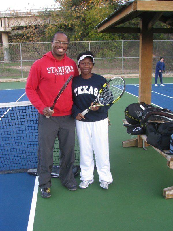 L to R: Mel Oakes, Andy Nnewihe, Chieze Ibeneche, Jim Vick, Paul Landry, Jim Harlow, Charles Thrash, Vernon Wong, Gordon Flack, Pete Pavlos, Don Hauck, Janie Flack, Dick Rew, and Pete Antoniewicz, October 14, 2014, Austin High. Missing Roger Bengtson.. Special thanks to Charles for the collection of antique racquets in the photo.