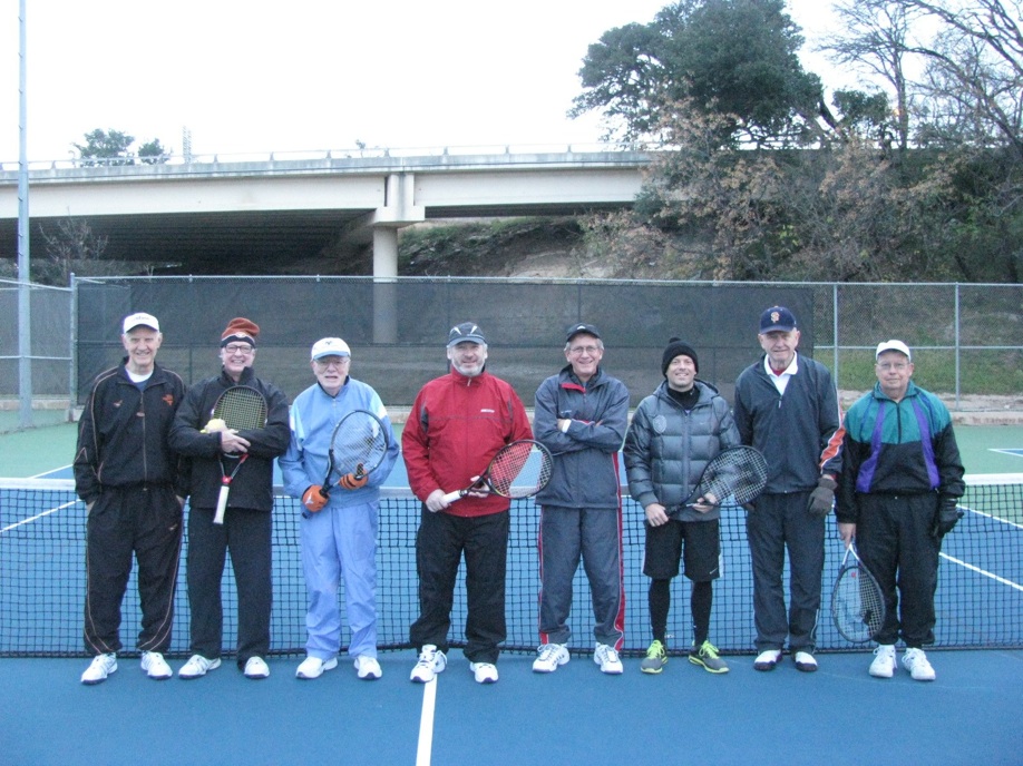 L to R: Mel Oakes, Charles Thrash, Don Hauck, Karol Lang, Dick Rew, Adam Antoniewicz, Jim Vick, and Pete Antoniewicz, Austin High School Courts, December 31, 2013, Austin, TX