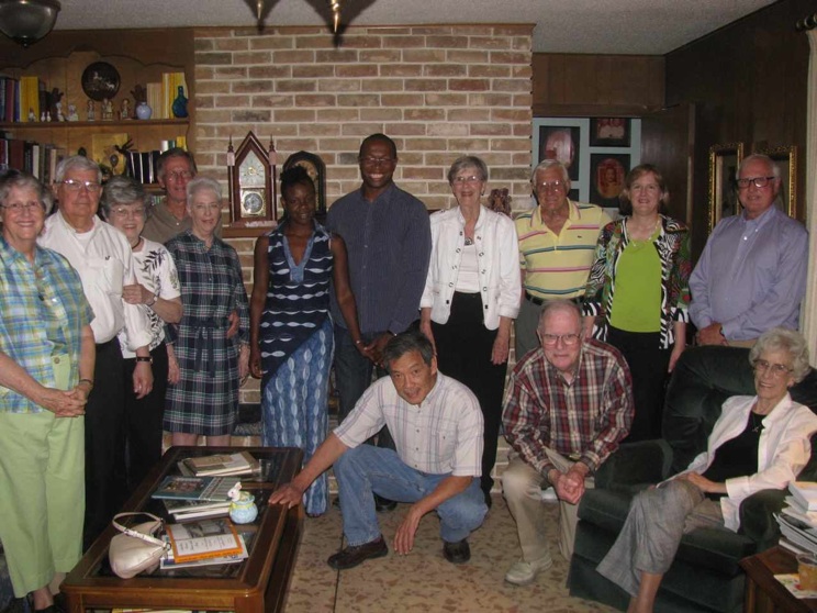 L to R: Pat Oakes, Pete Antoniewicz, Susan Antoniewicz, Dick Rew, Lynn Rew, Chieze Ibeneche, Andy Nnewihe, Janie Flack, Gordon Flack, Karen Thrash, Charles Thrash, Kneeling: Vernon Wong, Don Hauck, Marge Hauck in chair. Party celebrating engagement of Andy and Chieze, April 11, 2012, Oakes Home. Austin, TX