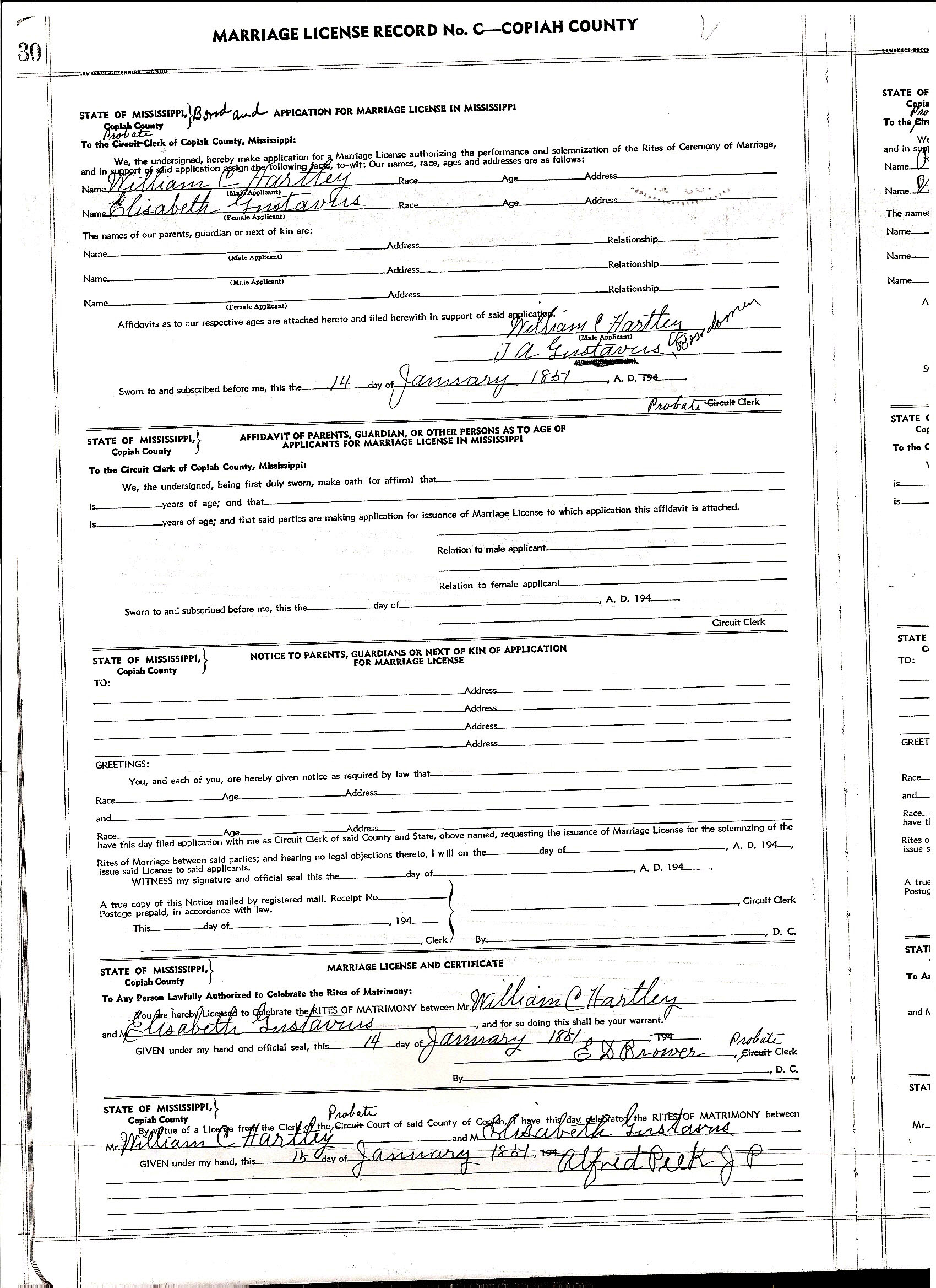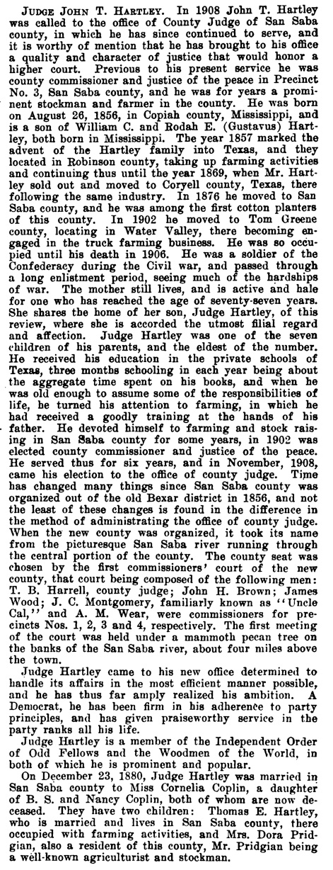 William Calvin (1825or1926-1905) & Rhoda Elizabeth Gustavus (1836-1916) Hartley were married Septembeer 15, 1851. William was a, brother of George H. Hartley. In 1850 census he is living with Richard Shira Hartley in Copiah County. There is speculation that Richard is his brother. William and Rhoda left Mississippi and went to Texas in 1857, settleing in Robinson County taking up farming activities and continuing there until 1869, when thy sold out and moved to Coryell County, Texas, where they also farmed. In 1876, they moved to San Saba county where he was one of the first cotton planters of the county. In 1902, he moved to Tom Greene county, locating in Water Valley, there he engaged in truck farming business. He worked at that business until his death in 1906.