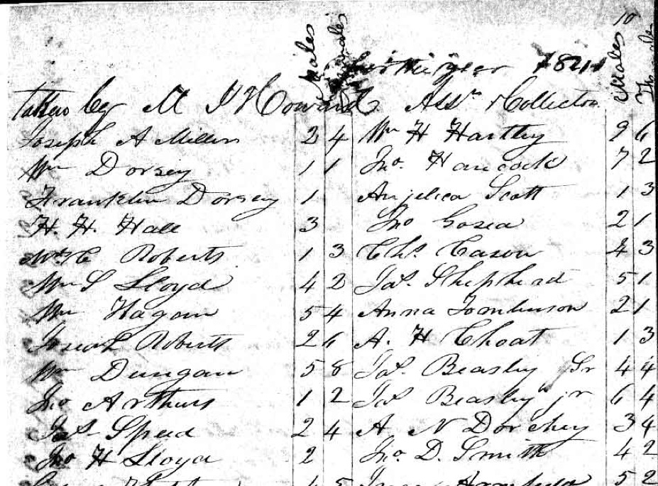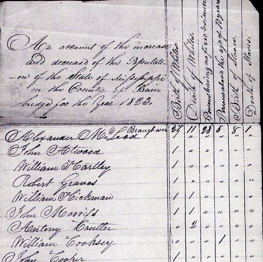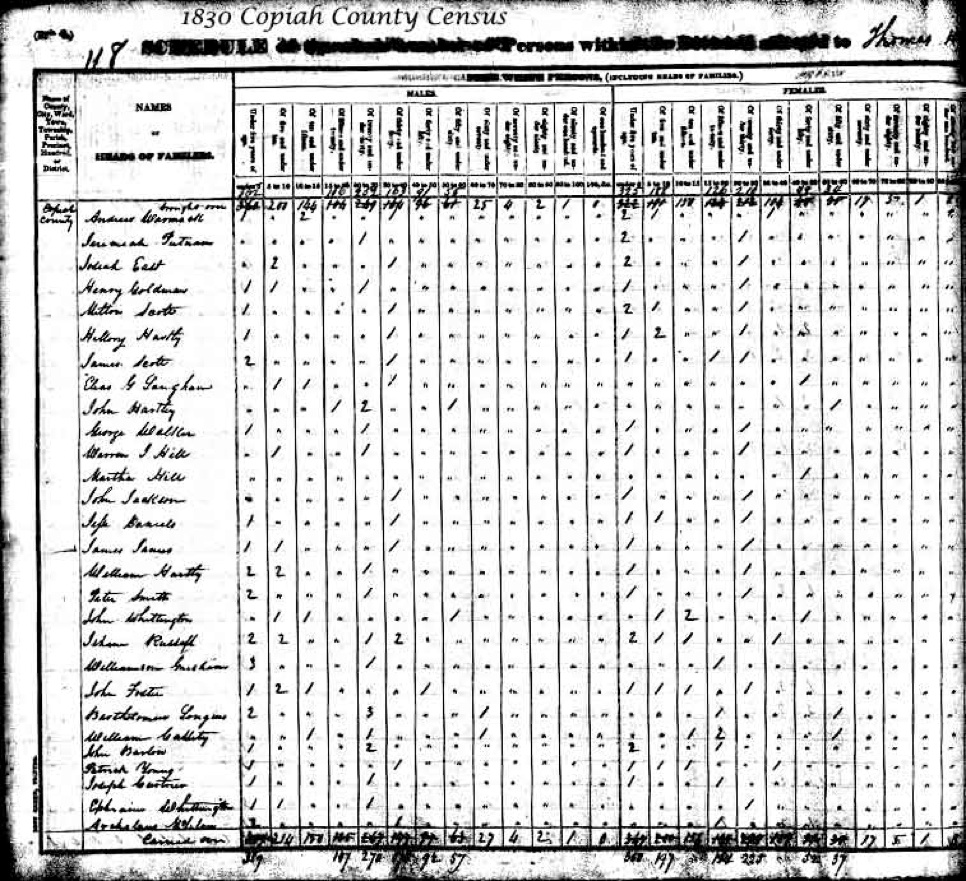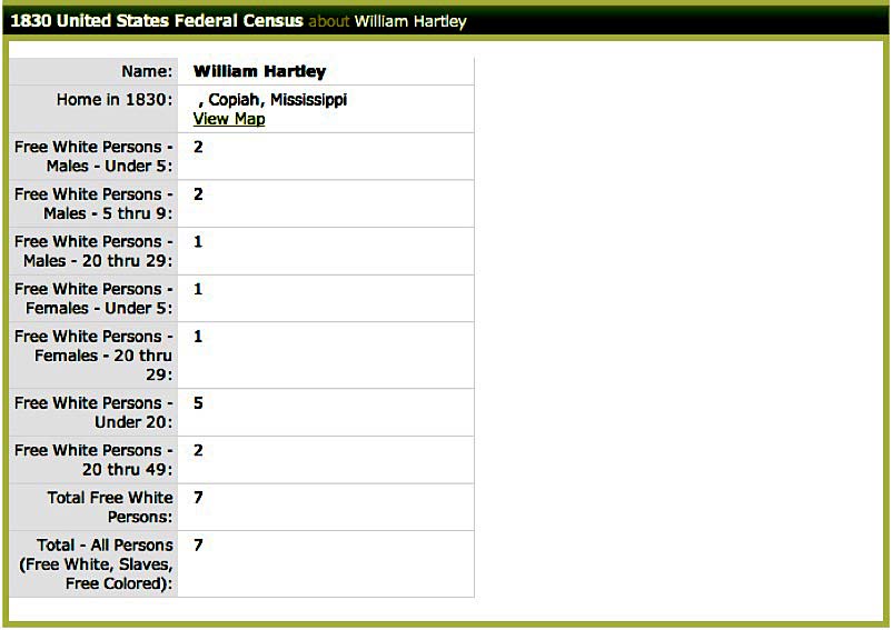 Frances Cronin (Ora Lee Hartley descendant) made an important discovery for our Hartley family. She found a U. S. Army Enlistment document (shown below), which includes the enlistment of our William Hartley, father of George W., Henry Clinton, William Calvin, Julia Ann, Nancy, Joel, Frances and Malinda Hartley. He would be my great-great-grandfather. A very sparse 1823 Mississippi census, at right, shows a William Hartley in Bainbridge, MS, with wife and a child that would match Joel T., their oldest son. We have a solid record of him and his family in the 1850 census in Copiah County, MS. The 1840 and 1830 censuses, while not giving wife or children names, does give household members in various age groups. We can match nearly all the children for the two censuses. Surprisingly, this analysis yields the existence of an unknown daughter. Presumably, she died after 1840 and before 1850. In the 1840 census, there is also an older male in the household that age-wise could be William’s or Frances’ father. Also in the household is a couple who are of comparable age to William and Frances, maybe a sibling and spouse. The 1841 Mississippi Territorial census lists a William H. Hartley in Copiah County with 9 males and 6 females in the household compared to the 10 males and 9 females in the 1840 U. S. Census.