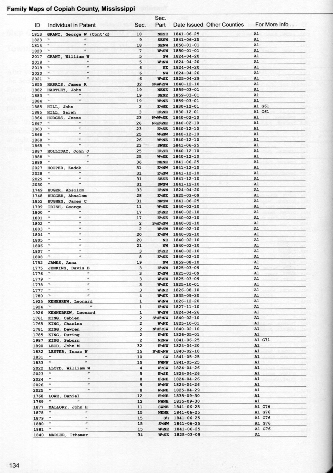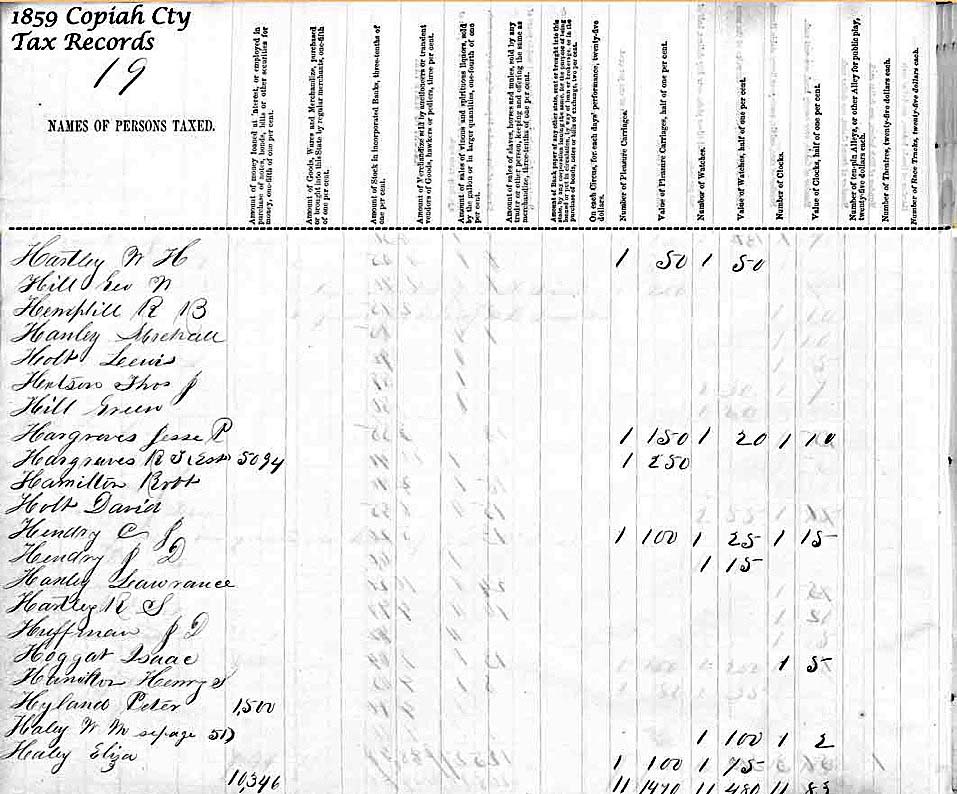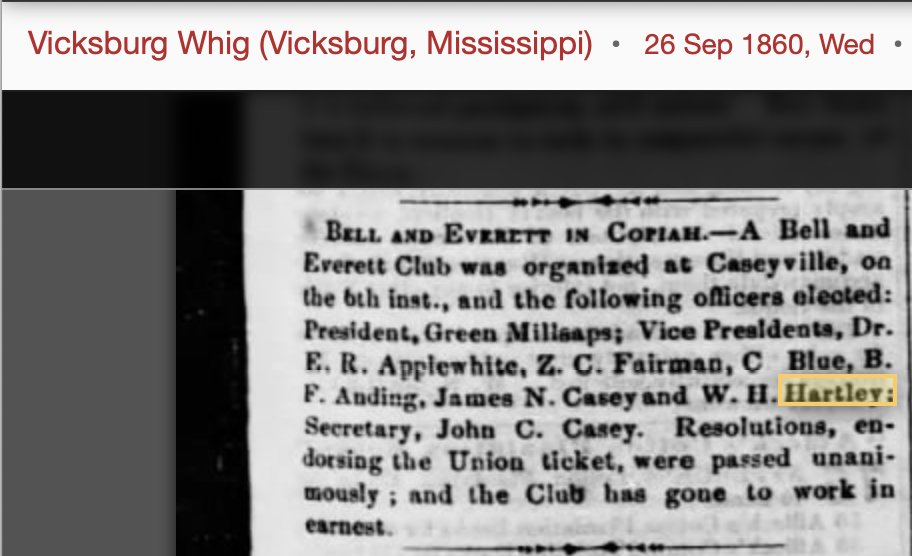 Throughout the 19th century censuses, William’s children are asked where their father was born, they are not consistent in their answers. William states in the 1850 census that he was born in Kentucky. The children, as adults, list Tennessee, Georgia and North Carolina. The 1850 census has William born about 1801, however census records are notorious for being off a few years. A William H. Hartley is in the 1853 Territorial census in Copiah County, MS. There are 2 males and 3 females in household. His older sons are nearby. William’s wife, Frances appears in the 1880 census living with daughter Malinda Hartley Ashley’s family in Bell County, Texas. Most census entries list Georgia as her birth place. Whether William went to Texas with her is unknown. More likely she moved there following his death.
