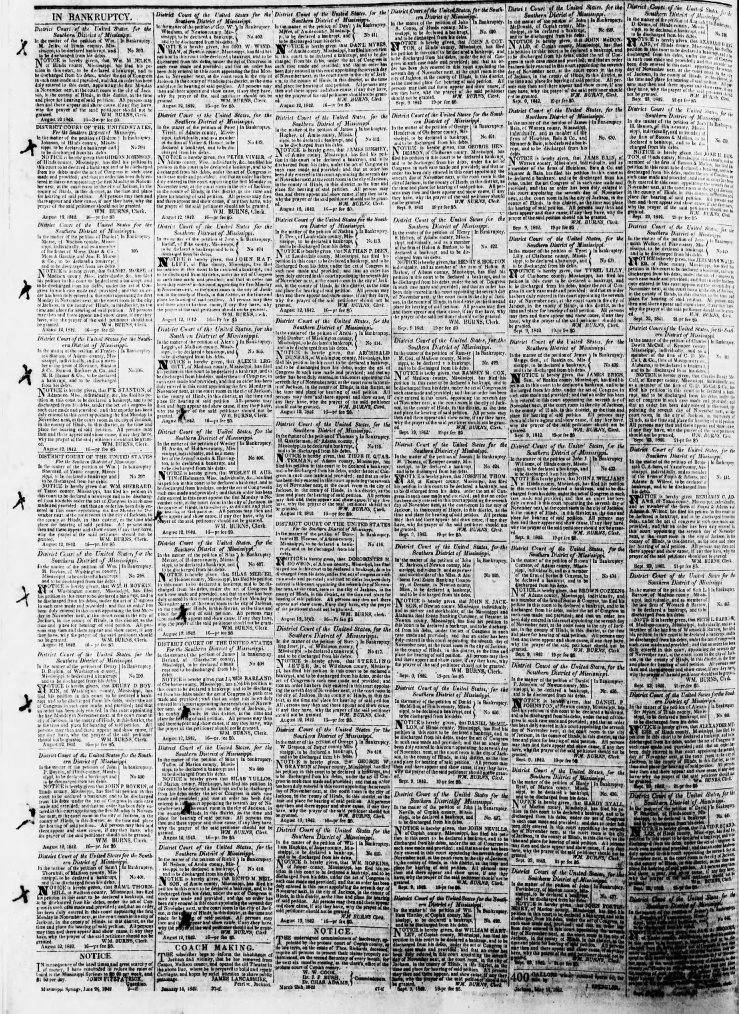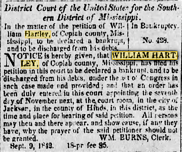 Bankruptcy notices in the Weekly Mississippian, September 30, 1842. William Hartley entry is 3rd from right bottom row..