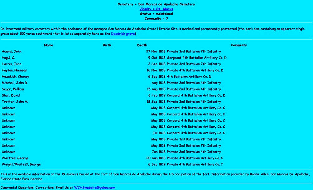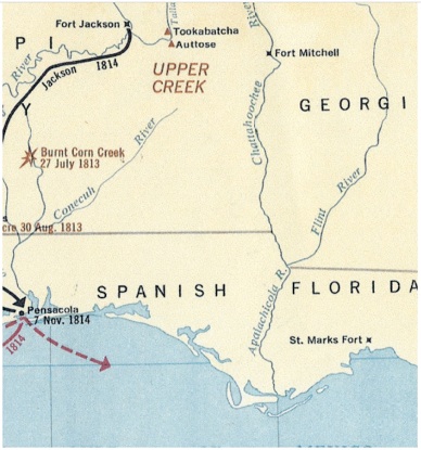 I have done some study of these places and pieced together a story of his tour of duty. It is my belief that he was part of Andrew Jackson’s Volunteers who were organized to quell Indian unrest in North Florida. This group, which included William’s unit, marched south from Nashville in 1817 and took the Spanish Fort at St. Marks, Florida. This fort was just south of Tallahassee, Florida on the coast. See map above. (One caveat: His record shows assignment in Natchez after Newport. Frances suggests he might have come down the Ohio River. If so, then he would later join Jackson in St. Marks.) My wife and I, during our years at Florida State University, would go to St. Marks for seafood, never suspecting my great-great-grandfather was there before. Two historical accounts of the campaign are included below. On May 7, 1818, General Jackson leaves Fort St. Marks and took 1000 of the men to Fort Gadsden. The document states that on May 8, 1818, William deserts, presumably headed for Mississippi, maybe Frances Taylor was waiting for him there. There were may desertions due to sickness.