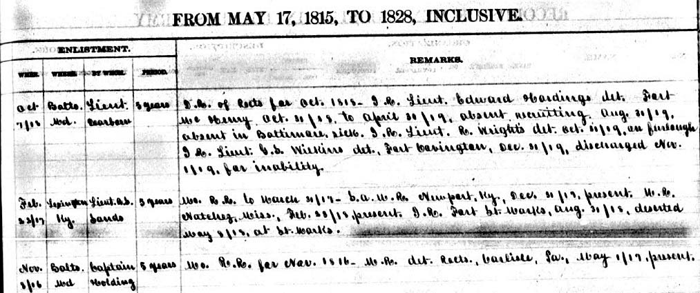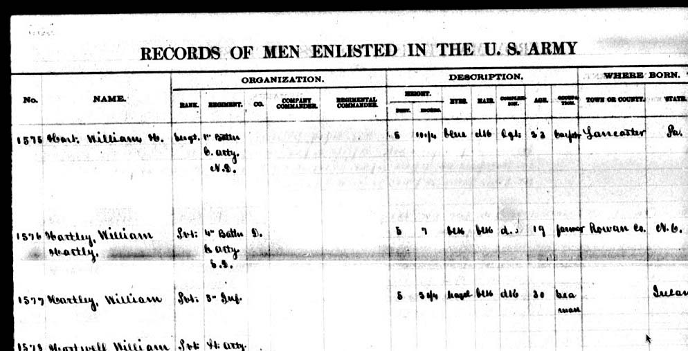 No. 1576 Hartley, William; Rank: Pvt, Regiment: 4th Battalion, Artillery, Company D., Height 5 ft 7 inches, Eyes: Blk, Hair: Blk, Complexion: Dark, Age: 19, Profession: Farmer, Where Born: Rowan County, NC, Enlisted: Feb 23, 1817. Location: Lexington, KY (there is a nearby Lexington, NC), Enlisted by Lieutenant A. S. Sands for period of 5 years, Remarks: Mo. R. R. to March 31, 1817— S. A. M. R. Newport, KY, Dec 31, 1817, present. M. R. Natchez, Miss, Feb 23, 1818, present. I (orJ). R. Fort St. Marks, August 31, 1818, deserted May 8, 1818, at St. Marks.