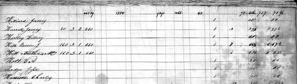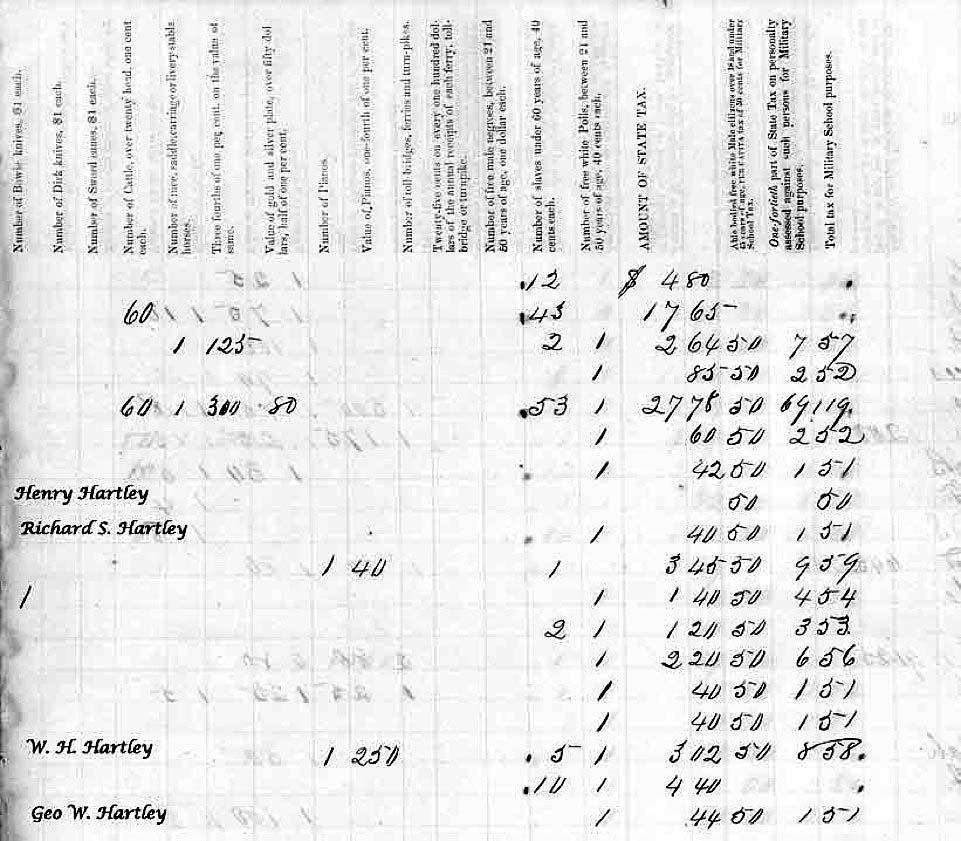There is an 1860 slave census for Copiah County, MS with W. H. Hartley listed as a slave owner. His one male and four female slaves are enumerated. (See adjacent document). No houses for the slaves are listed and no manumitted slaves were present. I doubt this is our W. H. Hartley since a slave owner listed right below William is E. R. Applewhite, who I find in the 1860 census, is a neighbor of a W. H. Hartley (b. 1825), clearly wrong W. H. Hartley. We have no information from the 1860 and 1870 Federal censuses relating to our William, the couple's whereabouts are unknown. In 1860, his son Joseph T., is in Morehouse County, Louisiana. He was born in 1822 in Mississippi so this puts William there at that time. I hope someone in the family will take up the challenge to find them. Frances and I will keep looking.