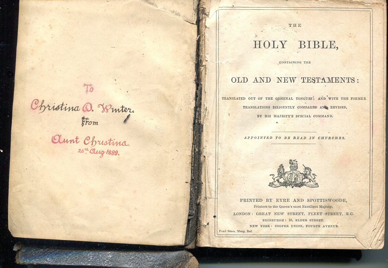 Christina D. Winter's Bible from her Aunt Christina Darling Winter (1846-1903), wife of John Bishop Winter, who lived in Perth Scotland. No copyright date. |