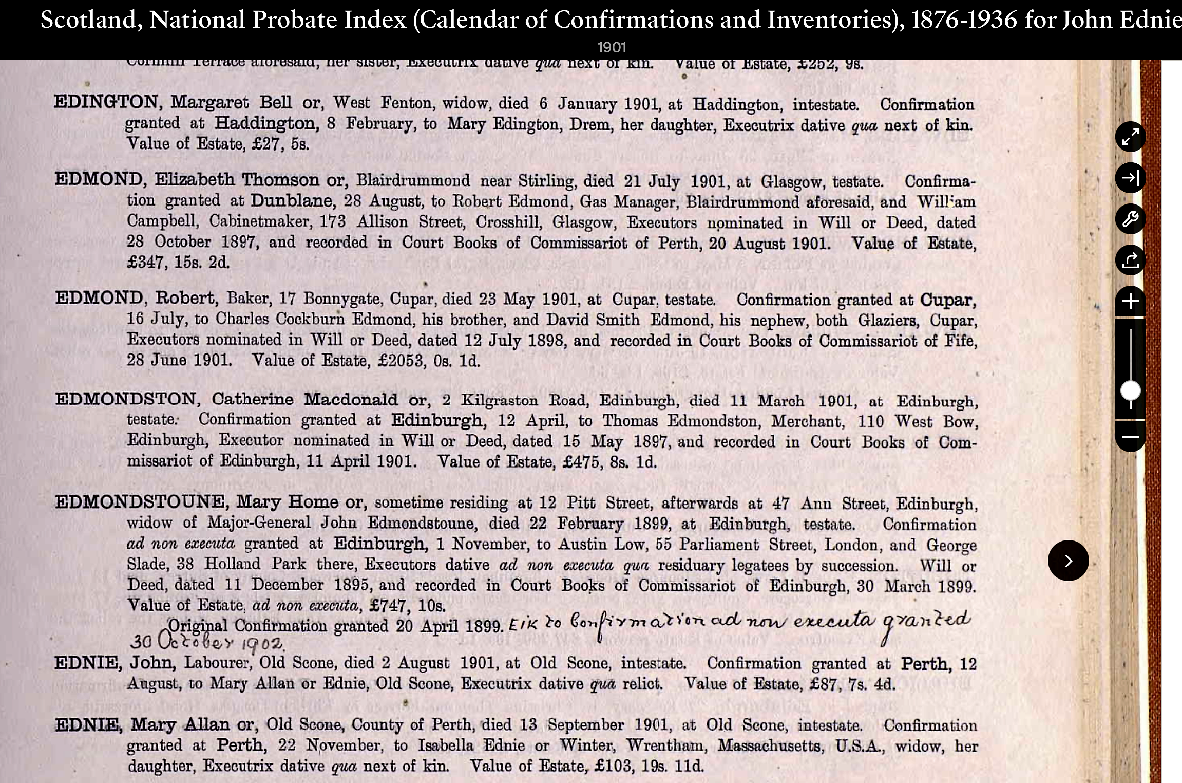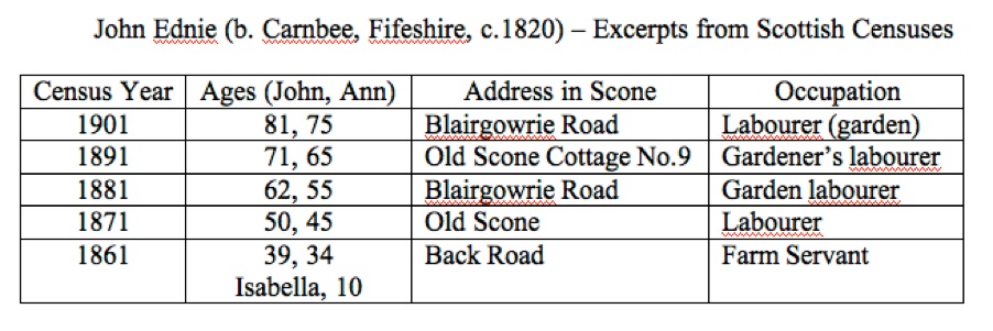 I have a subscription to Ancestry.com and looked up John Ednie in the Scottish census records. Ancestry does not have permission to reproduce the actual images (these are to be found on scotlandspeople.gov.uk which is a pay-per-view site) but has transcribed them, with the usual opportunities for errors. I have summarized the records from 1861 - 1901. Note that in 1891 John's address was given as Old Scone Cottage No 9, which is a distinctly different cottage. It may be a transcription error. In 1881 and 1901 it just says "Blarigowrie Road" which could be No.6. No.6 is a detached cottage, with a larger plot of land, and his seniority may have qualified him for it after 1891. One of the pleasures of this kind of research is using one's imagination to fill in the factual gaps.