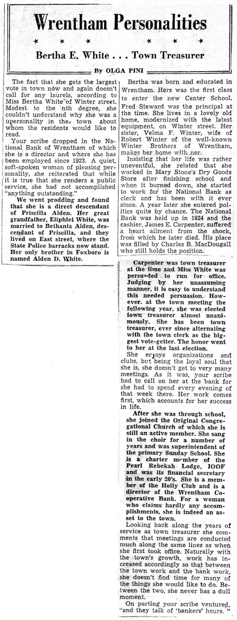 Mr. Brown also owned rental property on Taunton St. and for a small rental fee, he made it possible for the whole Winter family to move to Wrentham in 1901 before Grandpa Winter died. Lois Brown was 16 then and in high school.