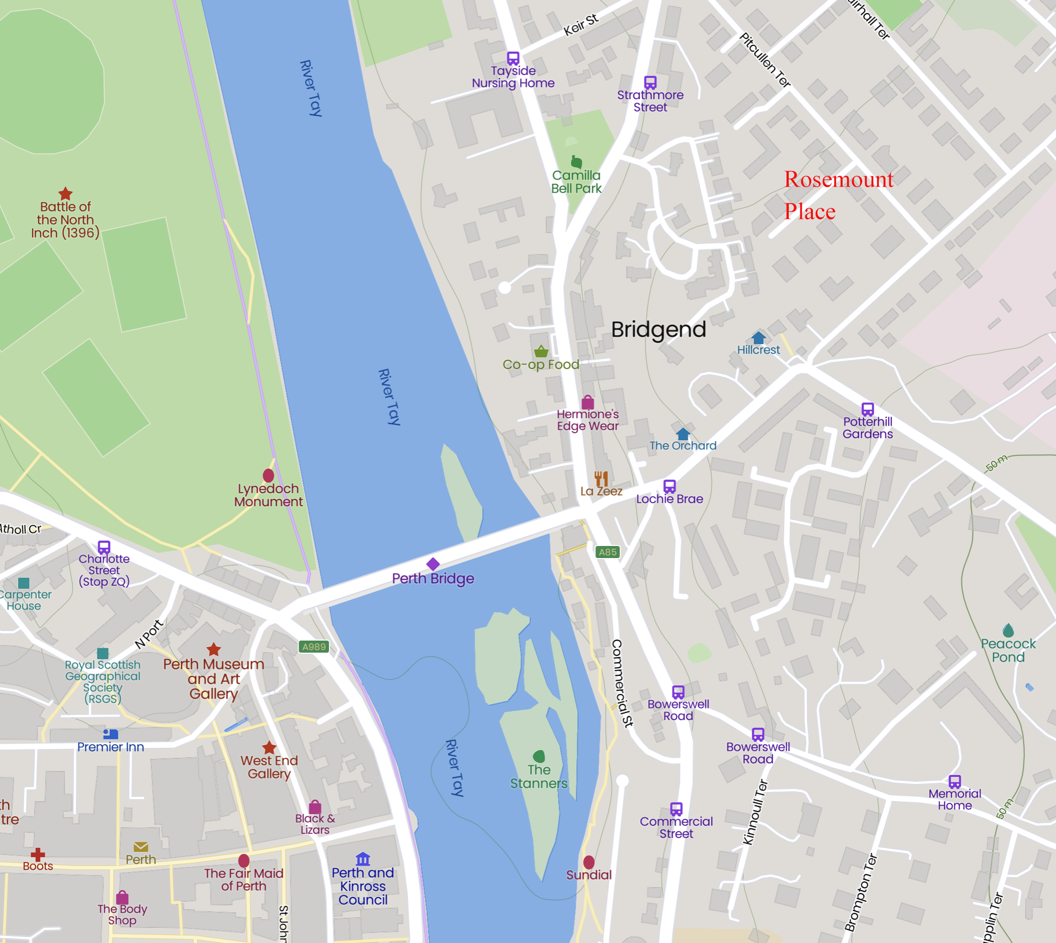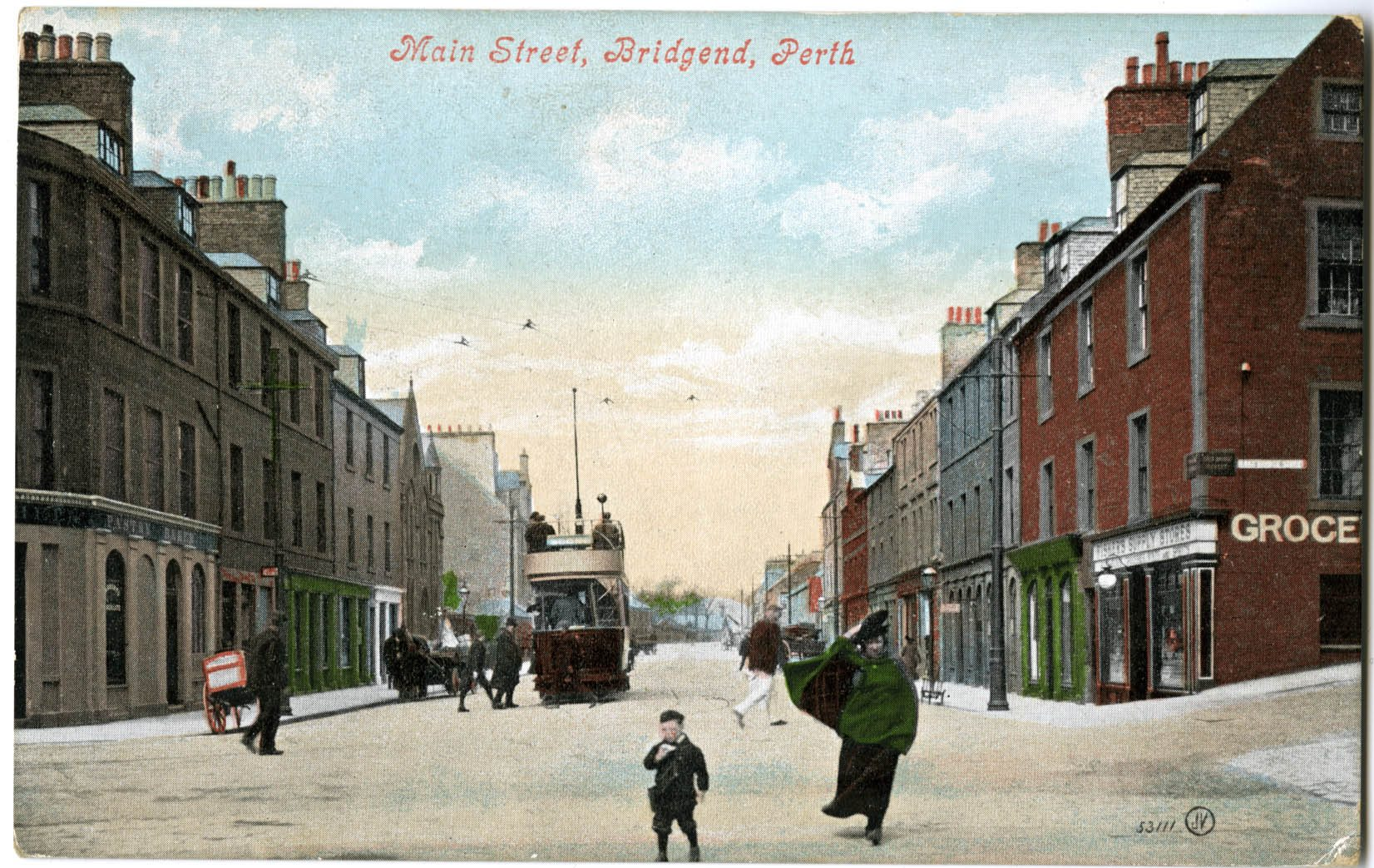 Bridgend was settled from at least the 16th century. It was formerly a leper colony and a place for “less desirables” from the city. By 1736, it was described as a sorry village with a few thatched hovels except for the house at the shore where the ferry boat landed. This and the houses at Potterhill and Rosemount were said to be the only respectable buildings. James Winter’s son, John Bishop bought a house on Rosemount. His daughter Mardie was born there. The road to Scone was a narrow dirty lane lined with mean clay huts. However when Perth Bridge opened, Bridgend blossomed into a thriving village with many new houses. There were at one time 16 taverns including Cross Keys. In the early nineteenth century the “smart set” built villas in Bridgend and Isla Road.