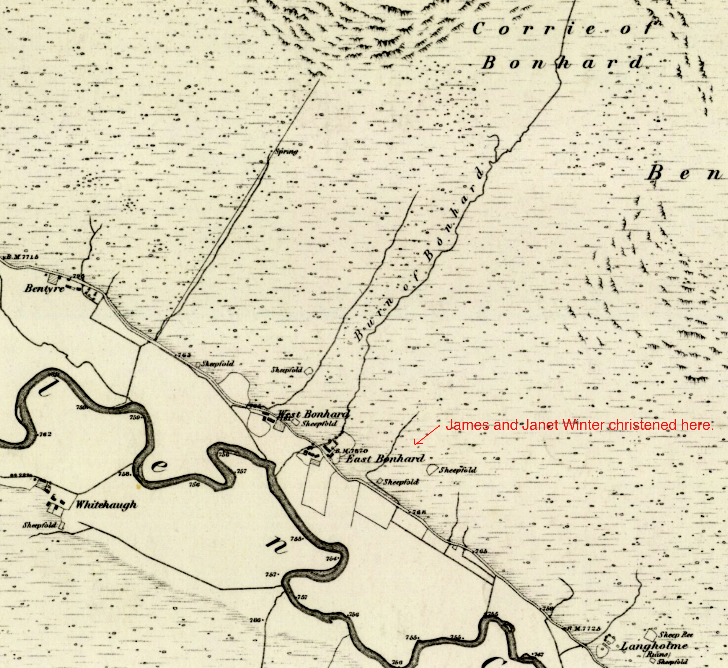 James Scott Winter (1797-1871) and his older sister Janet (1794-1830) were born in Clova and christened in Easter Bonhard. Previously I thought this was located near Perth, however David Murie discovered that there is another Easter Bonhard in Glen Cova which fits much better with the family dates and opened a door to additional information about the chronology of the Winter family. Here is a description of Glen Cova: "A Glen or Valley in the northern part of the United Parish of Cortachy & Clova, through which flows the River South Esk. The name applies to that portion of the Glen within the Old Parish of Clova, and extends from the Burns of North & South Inchdowrie in a N. [North] West direction, along the River, to "The Strone" and "Gourock Burn", Comprising parts of the Farms of Cadham, Clayleith, Kirkton of Clova, Mains, E. [East] Bonhard, Whitehaugh, Atton, Acharn and Braedownie. The map below maybe helpful. In the map on the right below we see Corrie of Bonnard in upper right corner. A corrie si a round hollow in a hillside. This corries drains into the Burn (stream) of Bonhard which drains into the South Esk River. The area to the east of the burn was called Easter Bonhard, simply East in the map.