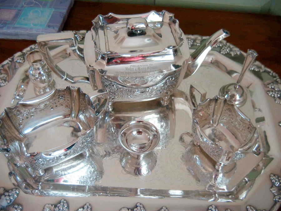 The silver service above is owned by Paul and Joanne Raymond Cummings. The inscription on the set says, “Presented to John and Mary Ednie on the Occasion of Their 50th wedding anniversary by a Few Friends and Fellow Servants, A. D. 1898." They were married in 1848. Joanne Cummings is the daughter of Beth Winter Raymond who was a granddaughter of Isabella Ednie Winter, who was the daughter of the above Ednies.