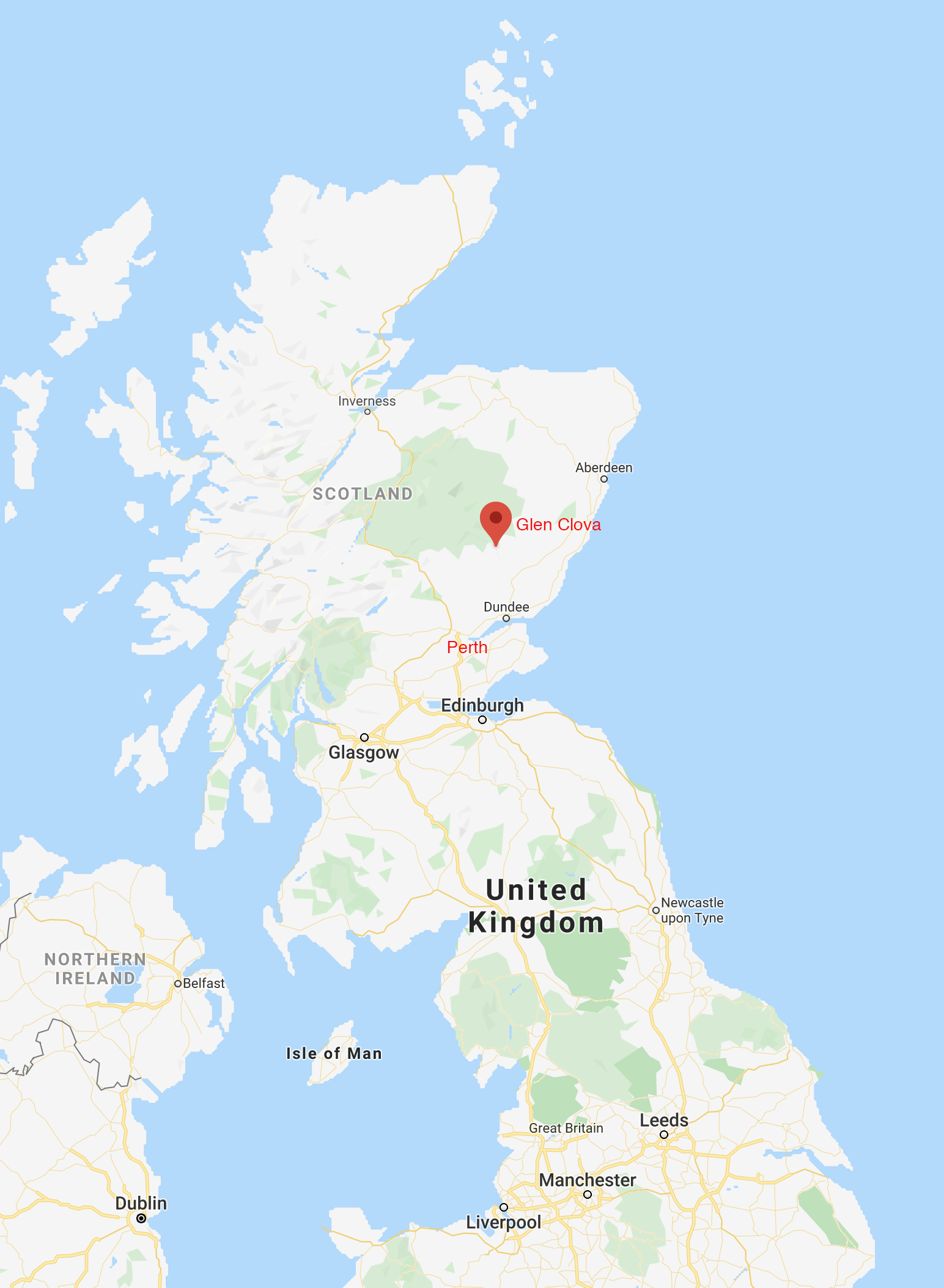 James, 32, a gardener, and Ann Crane, 23, (1806-?) were married 20 December 1829, in Airlie, Angus, Scotland. Airlie s about 15 miles from Glen Clova. They were probably farm servants as were most others in the parish according to records from 1790s and 1843. Ann was born in Glenkindie in Aberdeenshire north of the River South Esk valley. James and/or his father may have worked on the estate of Patrick Murray, suggested by the choice of this name for his youngest son. They started their family while living in Airlie. The parish records show the christening of their first child, Janet, in 1830 in “Lindertis”, which is about seven miles from Airlie.